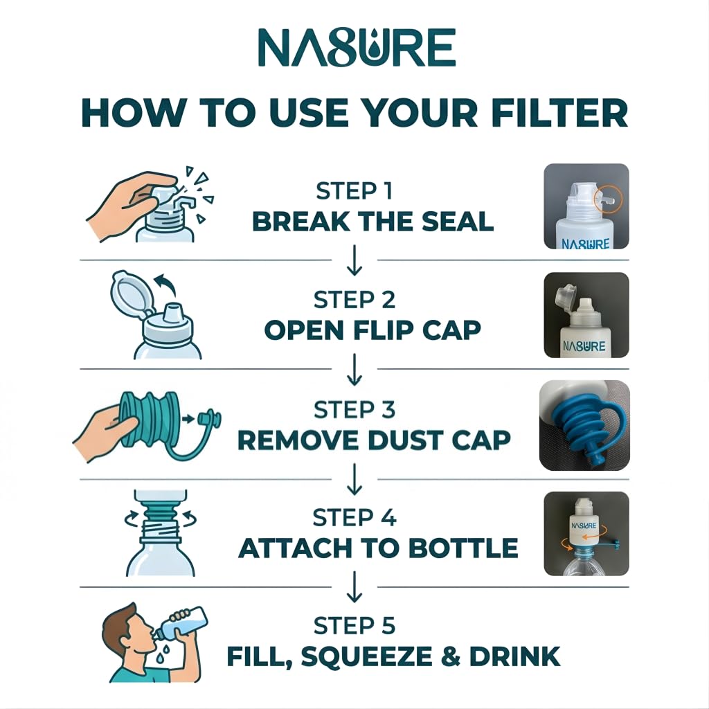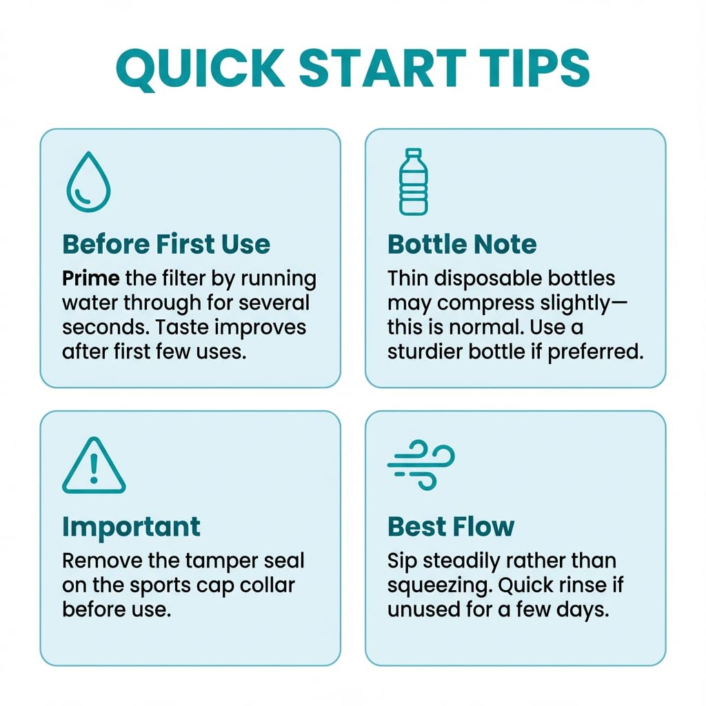 📕 Initial Activation Instructions: Like most new water filters, Na8ure may require a brief initial activation. Gently squeeze your bottle or take a few sips to help initiate water flow. Flow and taste typically improve after the first few uses.