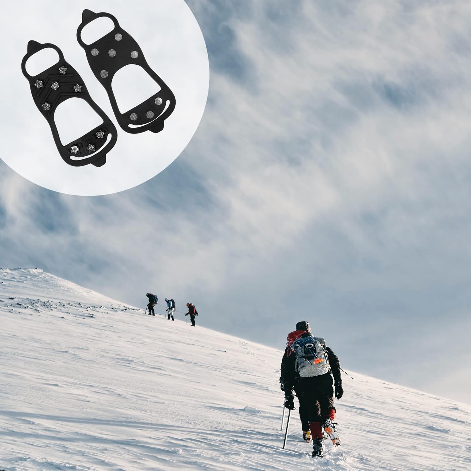 Special Design: Abrasion-resistant 16 multi-directional enhanced stainless steel spikes, which provides excellent traction on a variety of icy ans snow surfaces, so as to avoid slipping or blowing down in a snowstorm