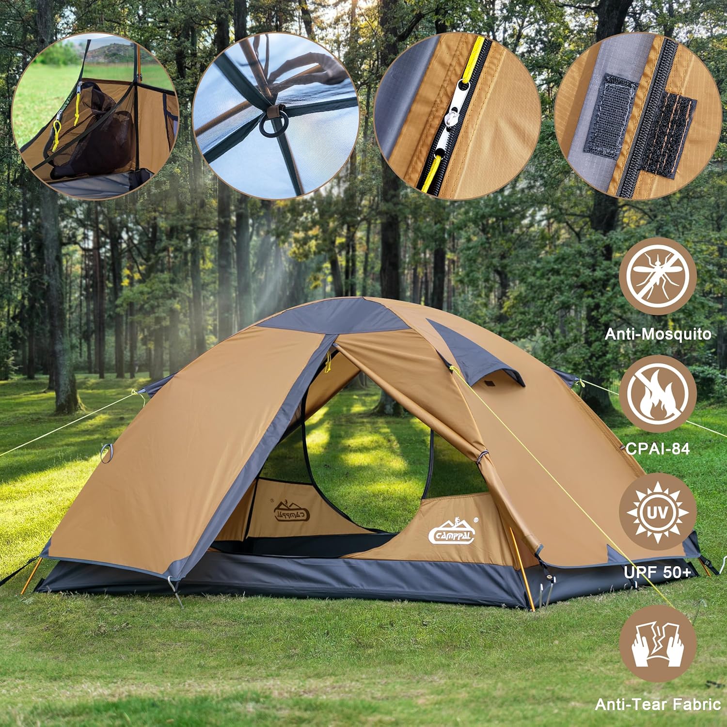 【Spacious & Comfortable Activity Space】With an interior size of 6.56ft x 4.26ft x 3.61ft and an outer fly size of 6.73ft x 6.56ft x 3.61ft, this 2 person camping tent offers ample activity space for two campers. The 2 man tent includes a gear loft and four pockets to keep your items organized. Double doors and two ventilation windows ensure excellent airflow, while the mesh inner tent keeps mosquitoes and insects out, providing a comfortable and enjoyable camping experience.