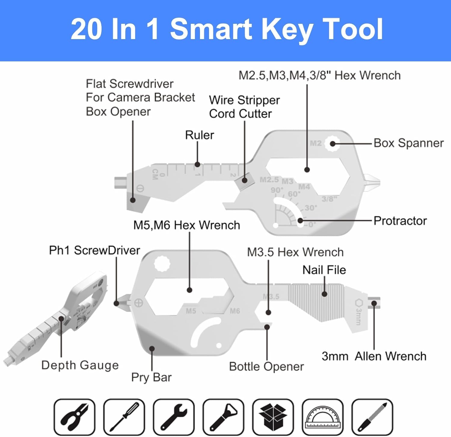 20 IN 1 Tool: Groninog key shaped multipurpose tool providing instant access to 20 different tools, including Hex Wrench, Pry Bar, Box Opener , Wire Stripper, Cord Cutter, Nail File, Depth Gauge, Wrench, Box Spanner, Ruler, Protractor etc.