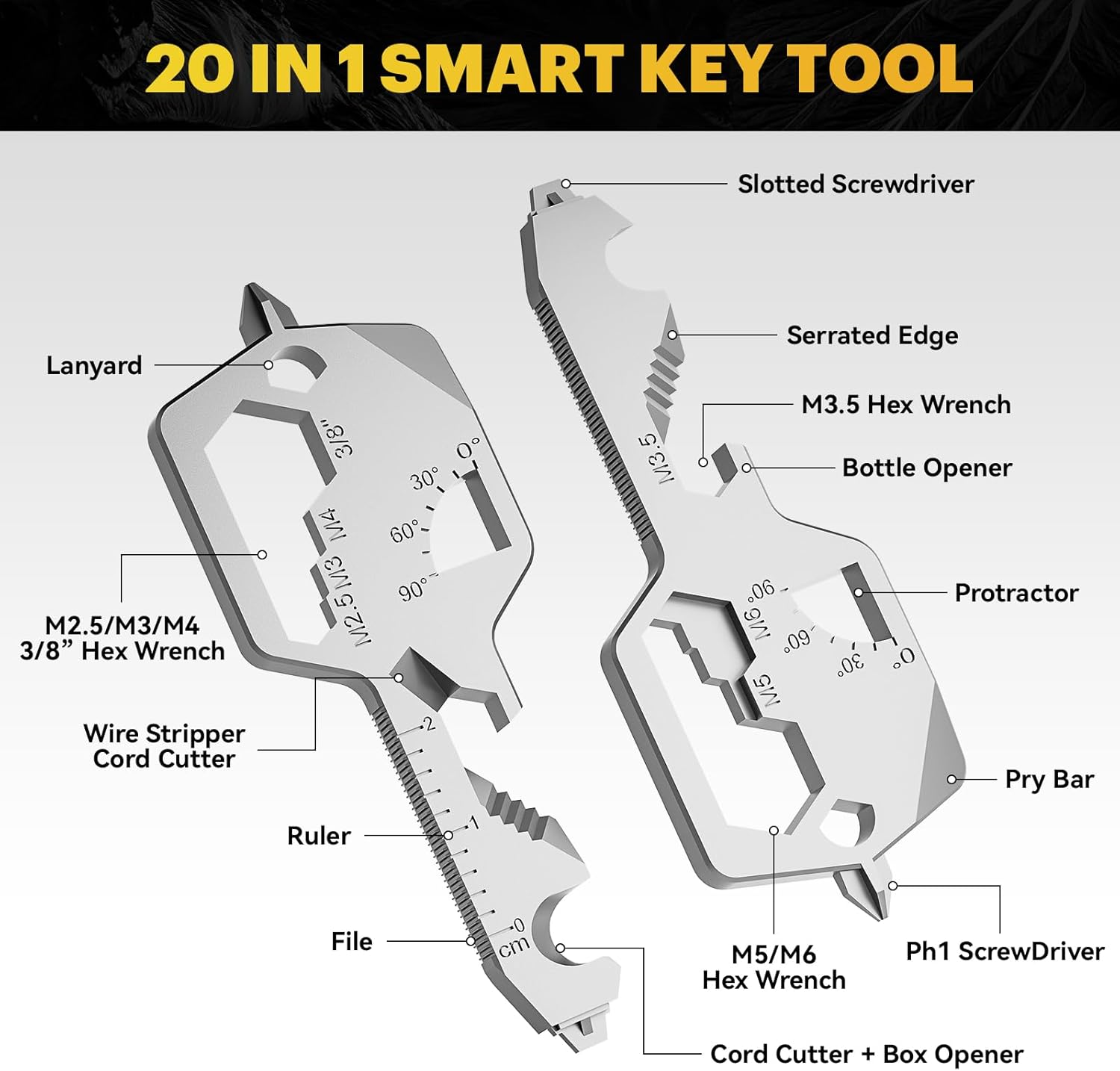 🗝️【420 stainless steel】The Key Shaped Pocket Tool is a 20-in-1 multitool that combines all your tool needs and fits right in your pocket; made of strong durable stainless steel; this tool is resistant to rust and corrosion, so you can be prepared for years to come.
