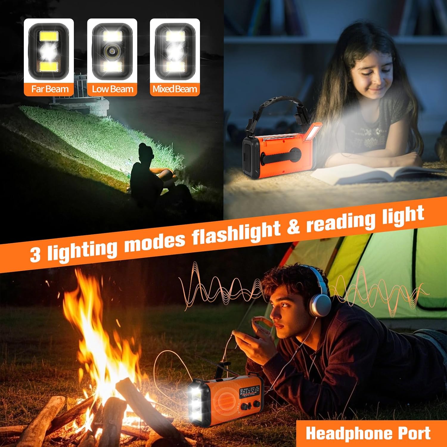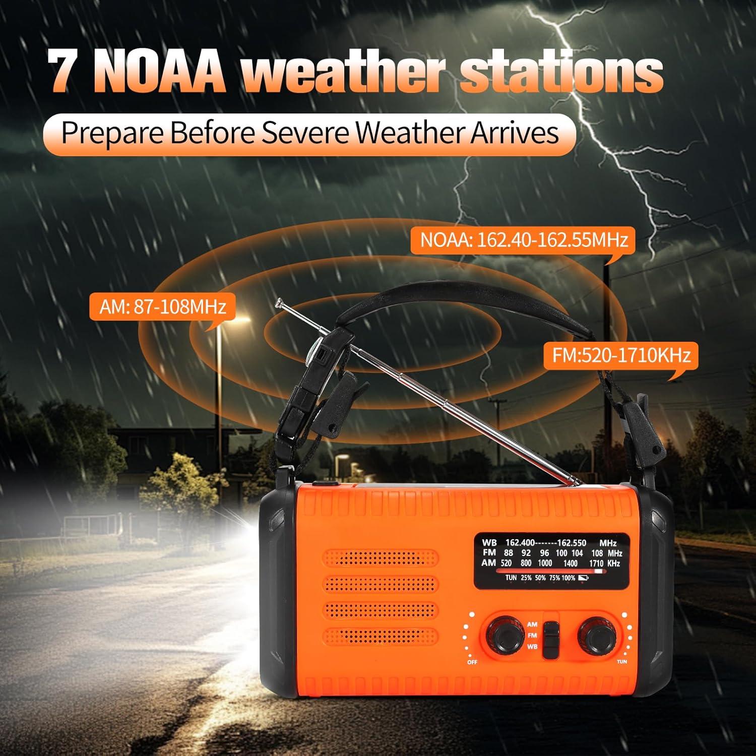 【High sensitivity reception of broadcast signals】 The emergency crank radio adopts a newly upgraded extended antenna and advanced DSP chip design, which can easily capture the latest information and warnings from NOAA (162.400-162.550MHz), AM (520-1710Khz), FM (87-108MHz) and other radio stations, reminding you of dangerous weather such as hurricanes, tornadoes, and severe storms in your area. The large volume knob design facilitates volume adjustment, and the 3.5mm headphone jack is thoughtfully designed, allowing you to immerse yourself in radio programs alone.