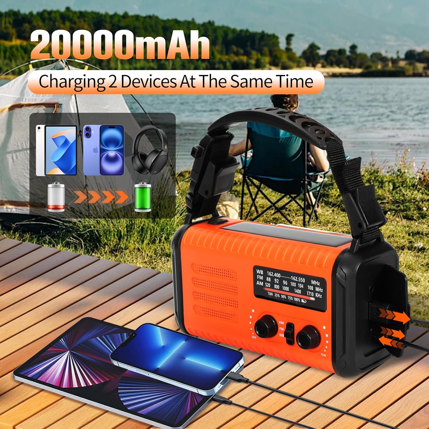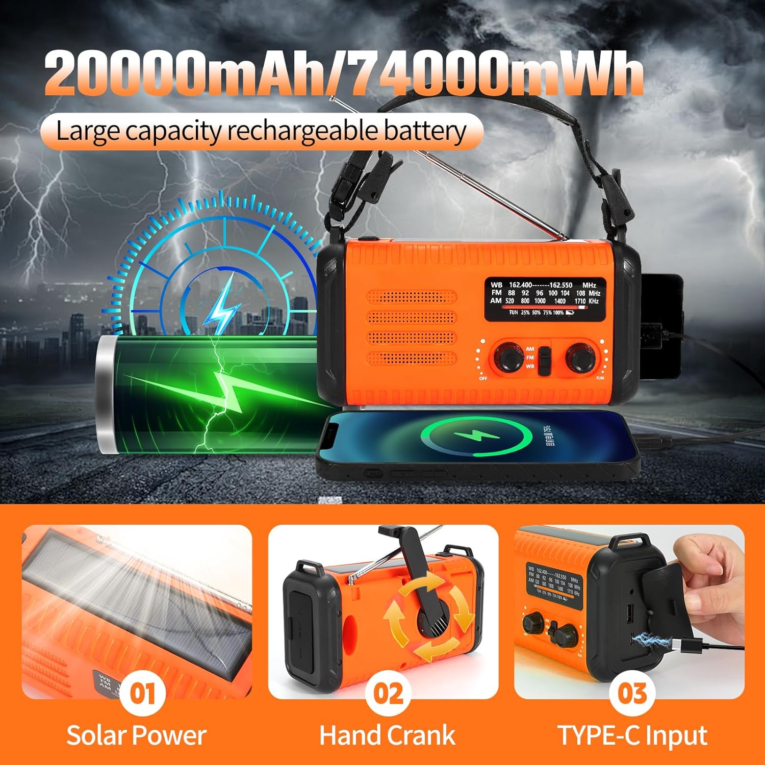 【Powerful emergency function】 The emergency battery radio has a built-in 20000mWh large capacity battery, which can be used as an emergency power source. Equipped with 2 USB outputs (USB-C/USB-A), it can charge two devices simultaneously, ensuring uninterrupted power supply for your smartphone and other devices in emergency situations, meeting your urgent power needs.