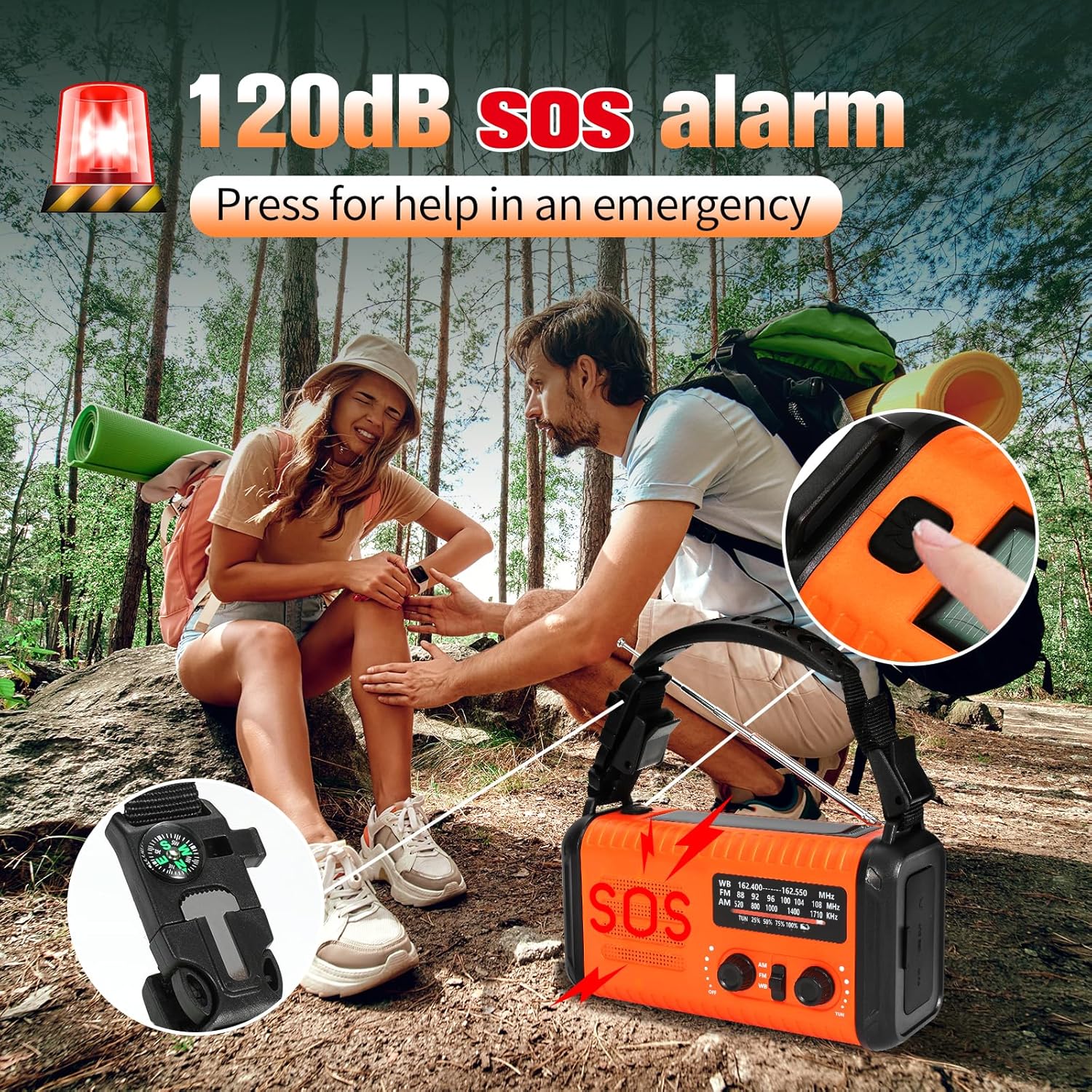【3 light sources and SOS alarm:】 The emergency weather radio is equipped with LED lights, which can be used as an emergency light source. It has three lighting modes (high beam, low beam, high beam, and low beam) and 8 LED reading lights to meet your different lighting brightness needs. These lights can be used to provide illumination at night, making it convenient for users to search for items and perform simple activities in emergency situations such as power outages. The SOS function can emit loud alarm sounds and flashing lights, allowing you to quickly draw attention to others in emergency situations.
