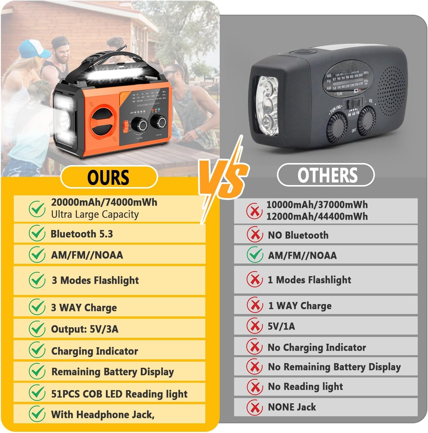 【An All-in-One Outdoor Survival Device】 – This is not merely a radio; it is a comprehensiv 20000mAh battery, hand crank, and solar panel collectively provide a robust power infrastructure for these essential survival features.