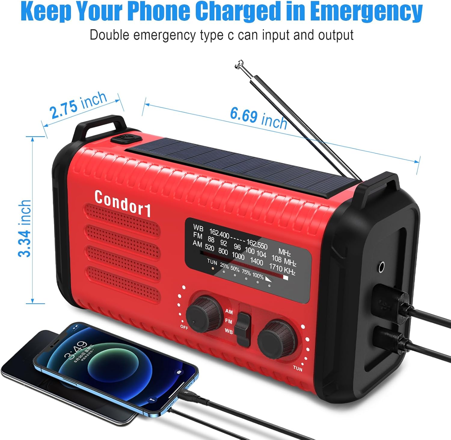 74000mWh Emergency Radio: Large capacity lithium battery emergency radio, built-in 20000mah battery, bi-directional output input port, can charge multiple devices at the same time. It also supports solar power, hand crank charging. Power is guaranteed even outdoors.