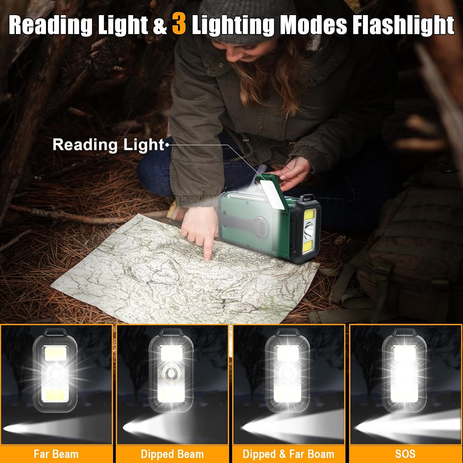 【Emergency Lighting & Compass】Equipped with a powerful 2W LED flashlight featuring 4 light modes to keep you safe during power outages and emergencies. A 1.5W rear reading lamp provides clear, comfortable light for reading or detailed tasks. Built-in compass ensures you stay on course and never get lost during outdoor adventures.