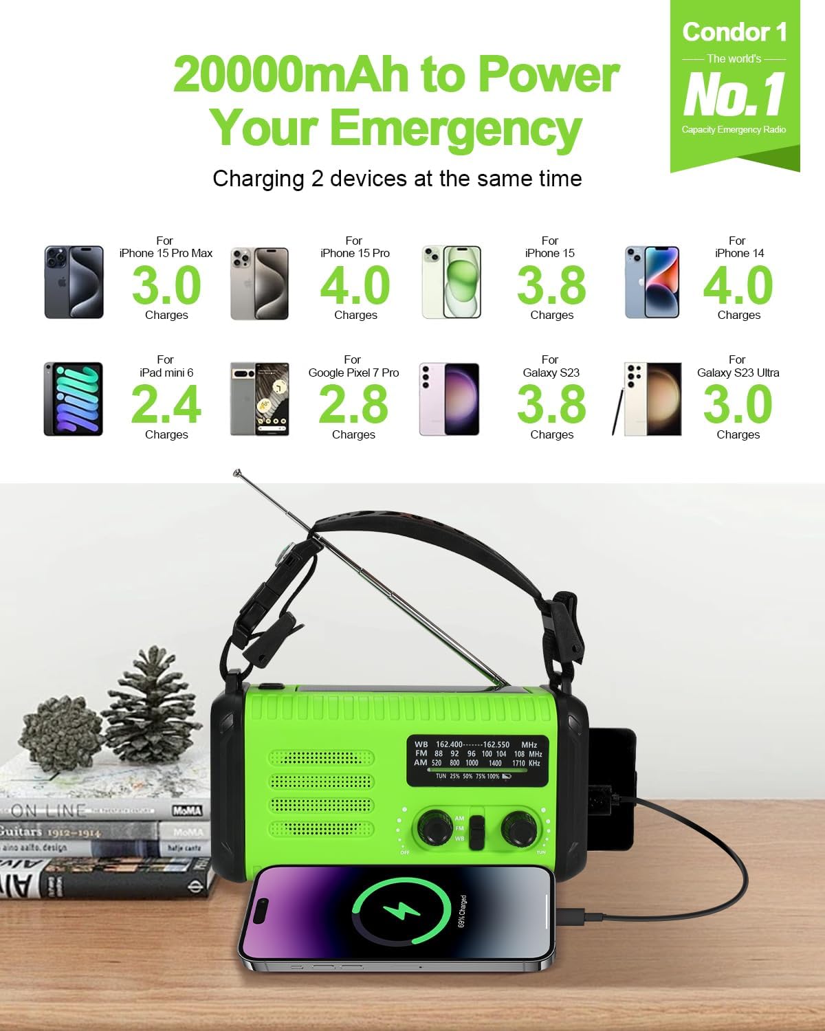 LARGEST BATTERY CAPACITY – iRonsnow Condor 1, The world’s No.1 capacity emergency radio 20000mAh, The large battery capacity can charge multiple mobile devices and also supports charging 2 devices at the same time. When a crisis strikes, it can even help the entire family avoid the risk of power outage.