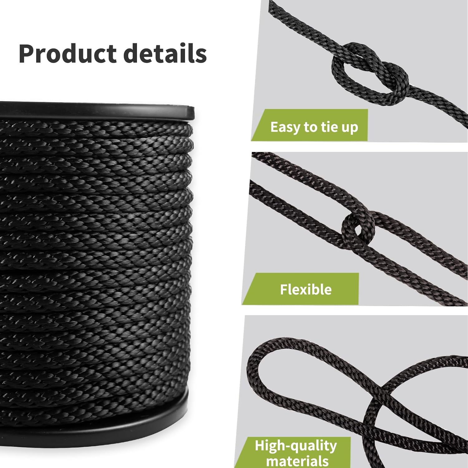 The black polyester rope can be used for hiking, camping, and survival tasks. It’s also ideal when making DIY crafts! This Multipurpose, High Strength, Easy to Knot Rope is Ideal for Indoor and Outdoor Applications