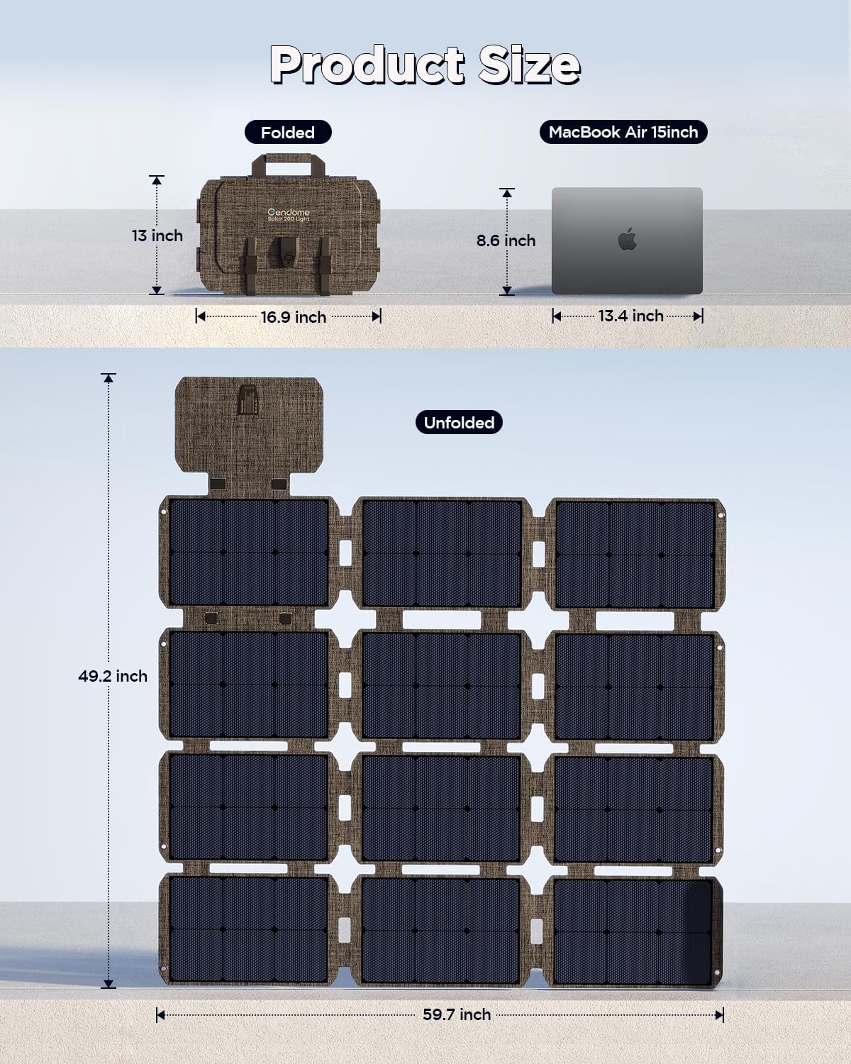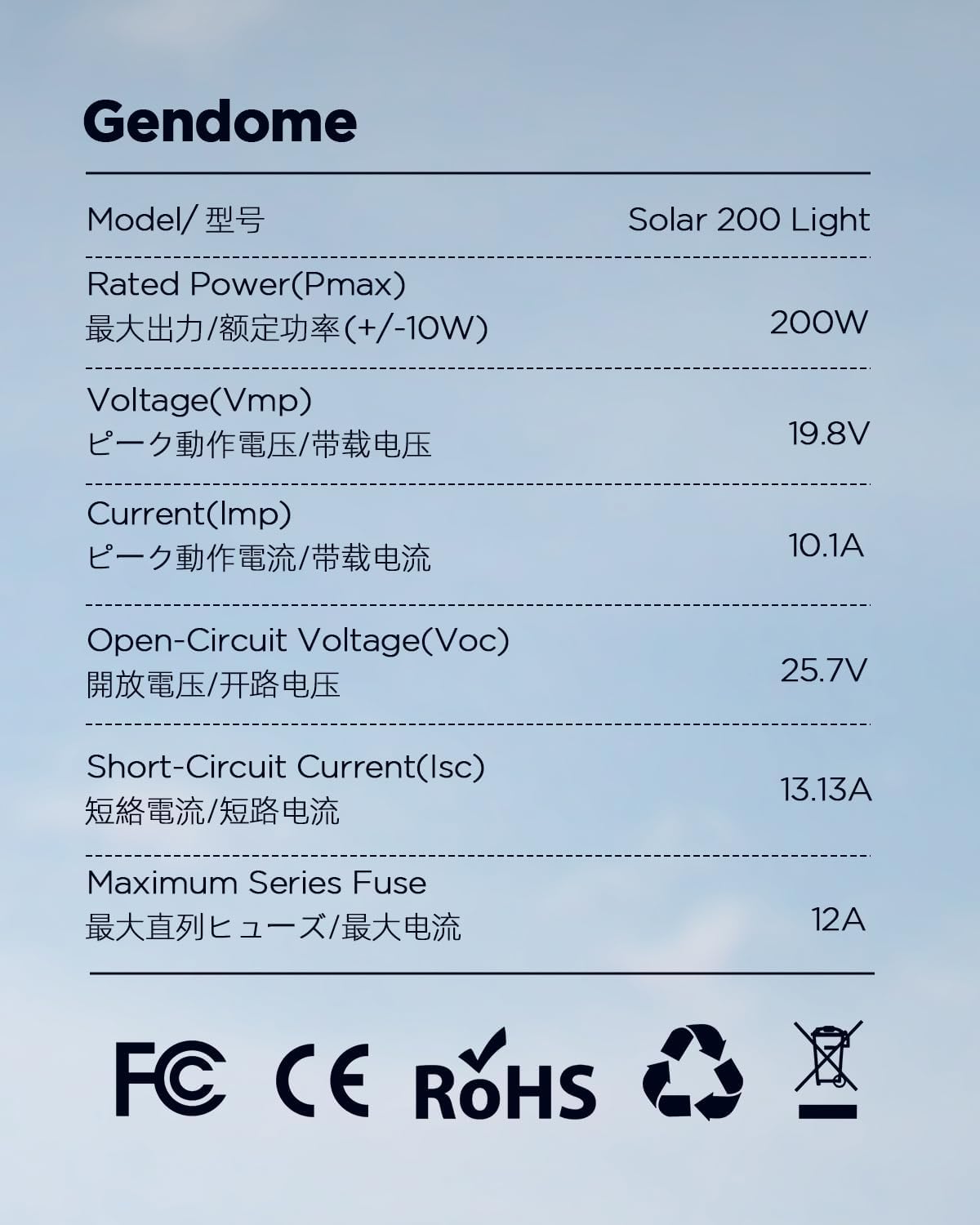 200W High Power, Fast Charging: Gendome solar panel provides 200W of high output power, capable of quickly charging power stations. Whether you’re outdoors or during a power outage, it efficiently delivers reliable power, ensuring your devices stay charged