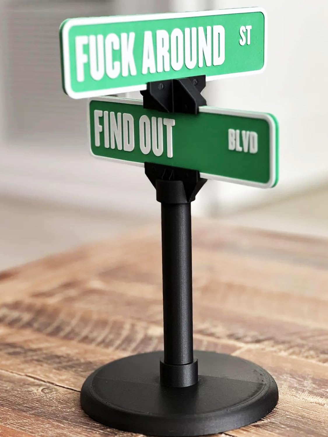 ✅【Exceptional Durability】 Experience the precision of High-Quality 3D Printing with our intricately detailed and robust Fuck Around and Find Out Street Sign, designed to withstand the test of time and remain a centerpiece of your desk for years.