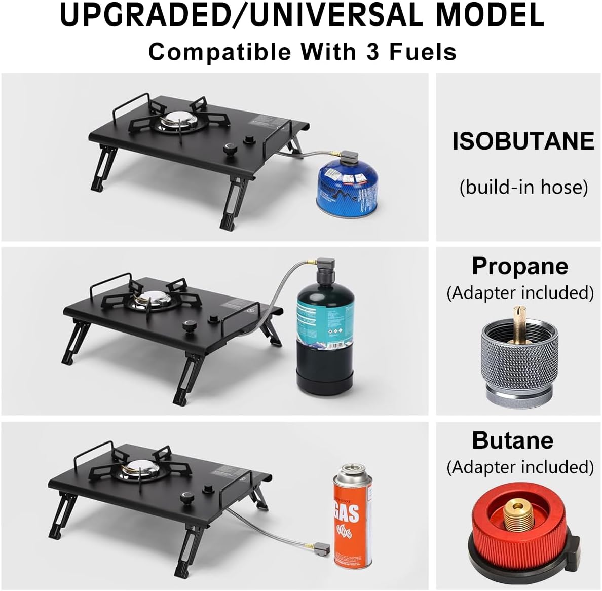 2 Ways To Use: this IGT camping stove could be used in 2 ways. By unfolding the legs, you could put the stove on the table top. By folding up the legs of stove, you could embedded into our IGT camping table.