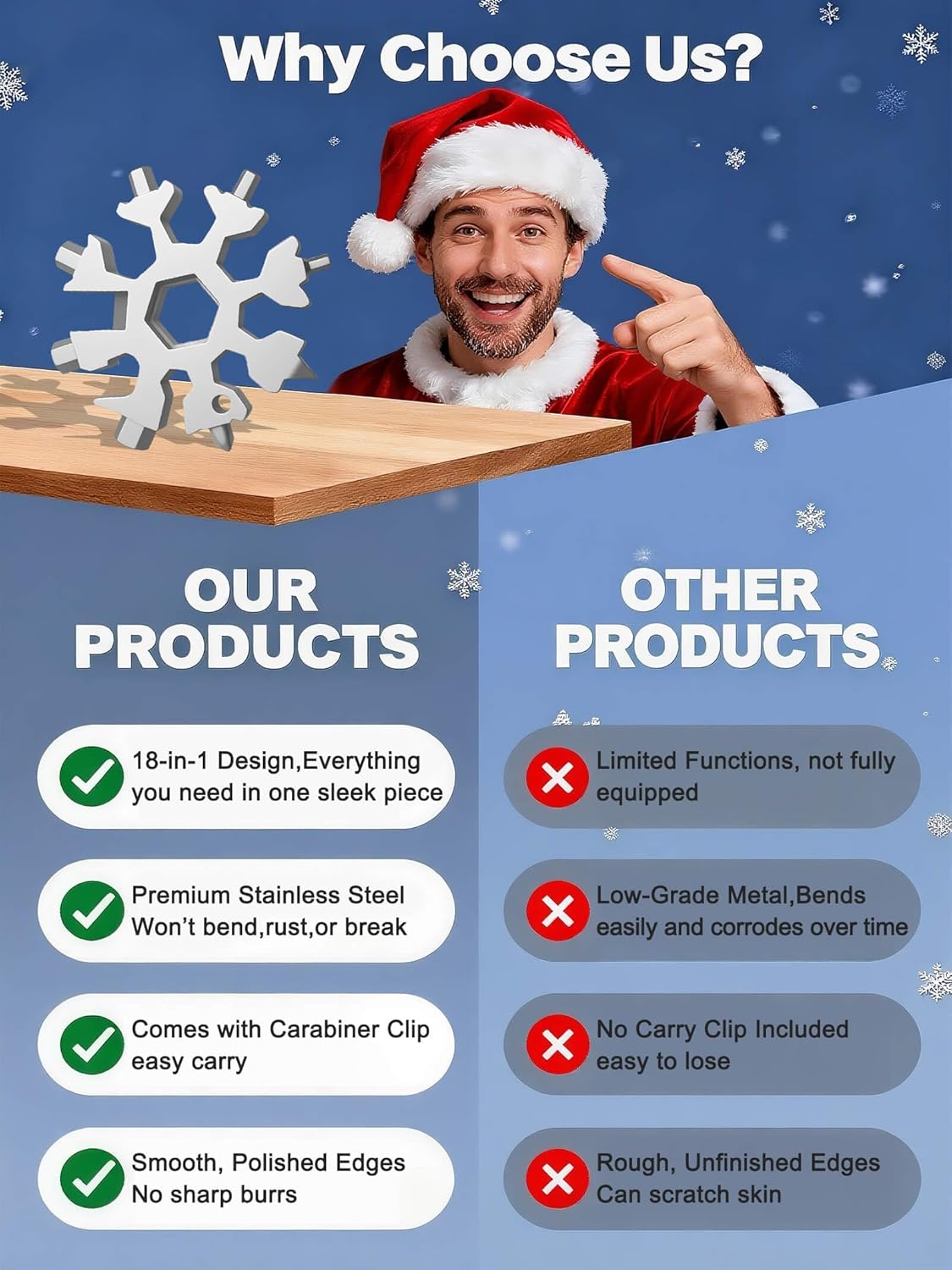 Multifunctional Snowflake Tool: Combines bottle opener,slotted and Phillips,screwdrivers,metric allen wrench (3–8mm),external hex wrenches (8-16mm),box cutter,keychain hole & rope cutter.Perfect for camping,cycling,DIY repairs and emergency fixes