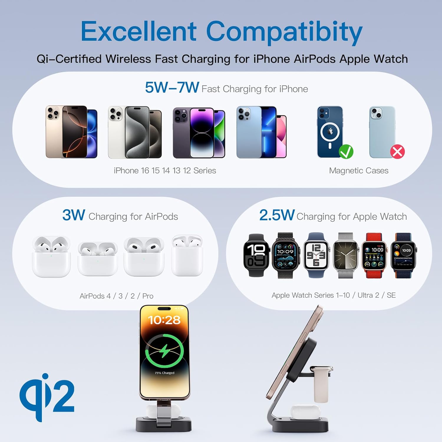 3 in 1 Foldable Wireless Charger: Magnetic charging station, suitable for a wide range of devices;easy to adjust the angle of the device vertically or horizontally, precise attachment and non-slip; fast full charge in 2.5 hours; give you a stable charging experience.