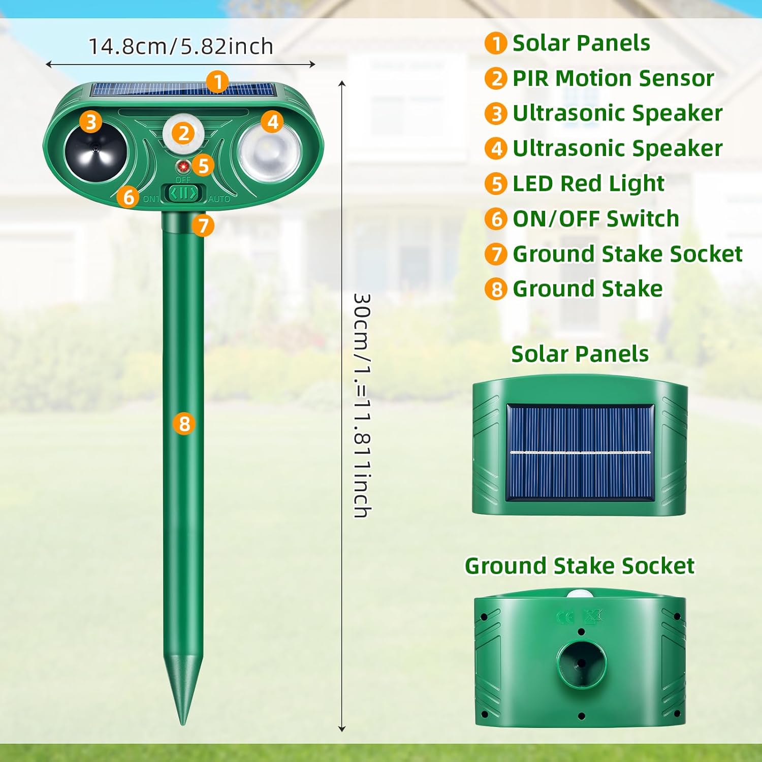 【Safe for Human & Pets】 Employing a pure physical exclusion method, our ultrasonic animal repeller outdoor device is completely harmless to animals, pets, and humans. It provides a humane solution to protect your property. This versatile rodent and animal deterrent is perfect for safeguarding gardens, yards, lawns, driveways, and other outdoor spaces from unwanted intrusions.