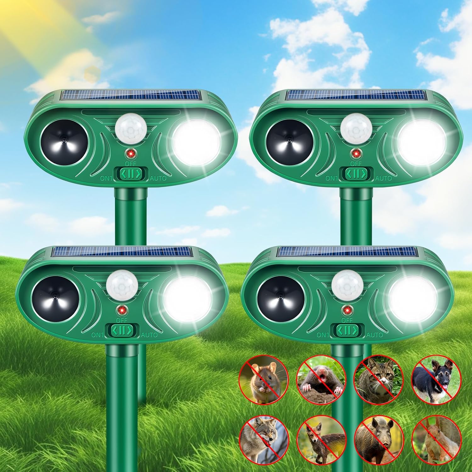 【Motion-Activated Ultrasonic & Strobe Repellent】Our upgraded outdoor animal repellent uses a highly sensitive PIR motion sensor. Once movement is detected, it emits a powerful ultrasonic sound combined with a startling flashing LED strobe light. This dual-action system safely and effectively deters a wide range of pests including deer, raccoons, squirrels, skunks, rabbits, cats, and dogs from your yard, garden, or lawn .
