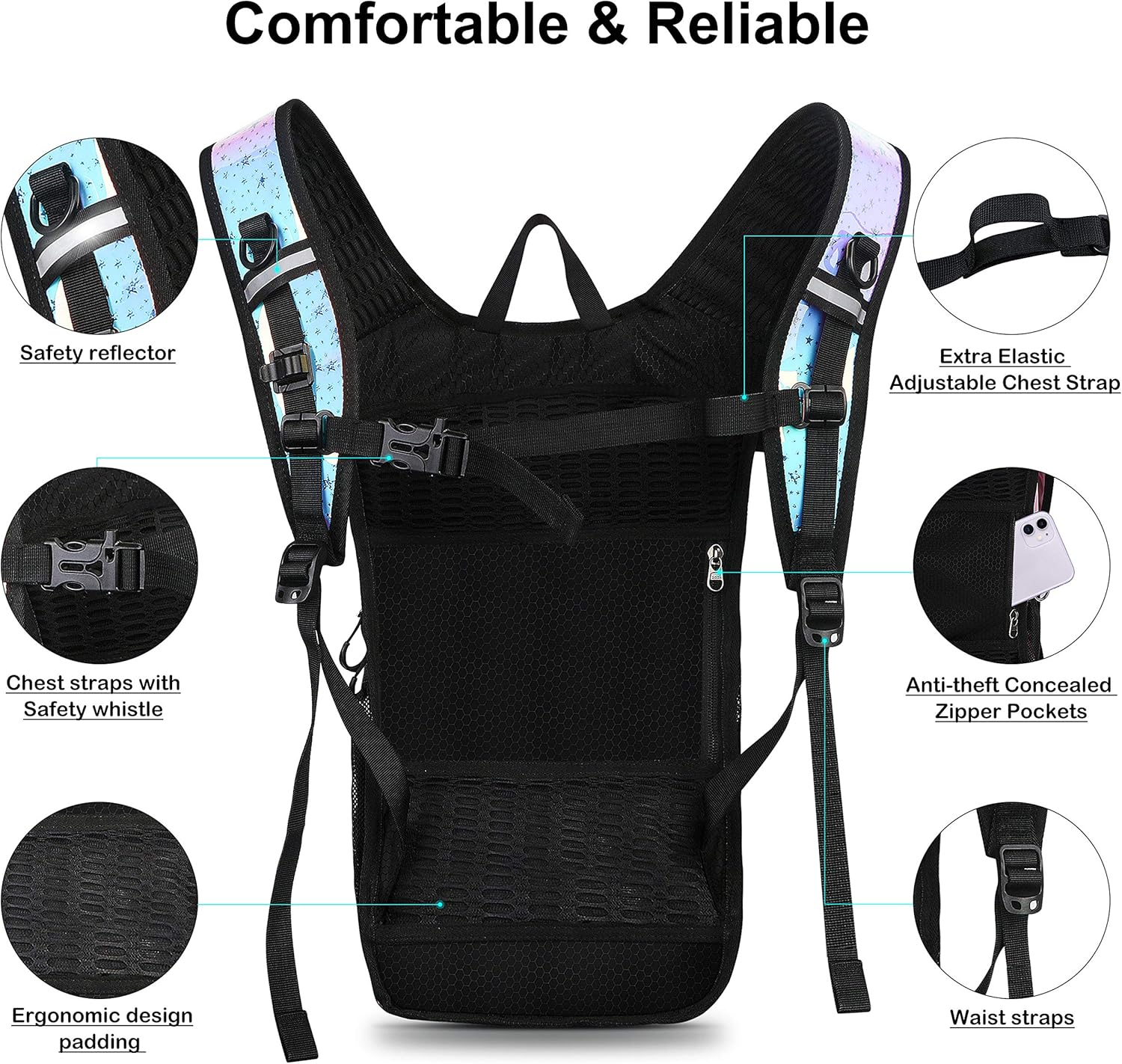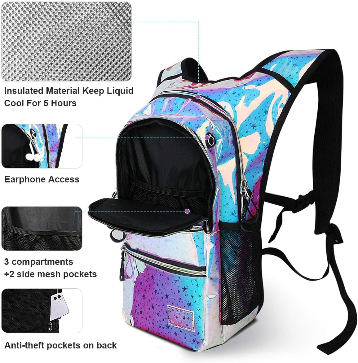 β¨[RAVE HYDRATION BACKPACK SET FOR FESTIVALS & OUTDOORS ADVENTURE]: Included 70-Ounce (2 Liter) BPA FREE & food grade hydration water bladder, Test Report will be sent to your e-mail. Bright colors, unique styles, padded shoulder straps, breathable system and lightweight design are the perfect tool for outdoor sports and Festival day. Specifically designed for those who want to stand out at their next music festival, rave, edm or edc event and anywhere else style is as important as function.