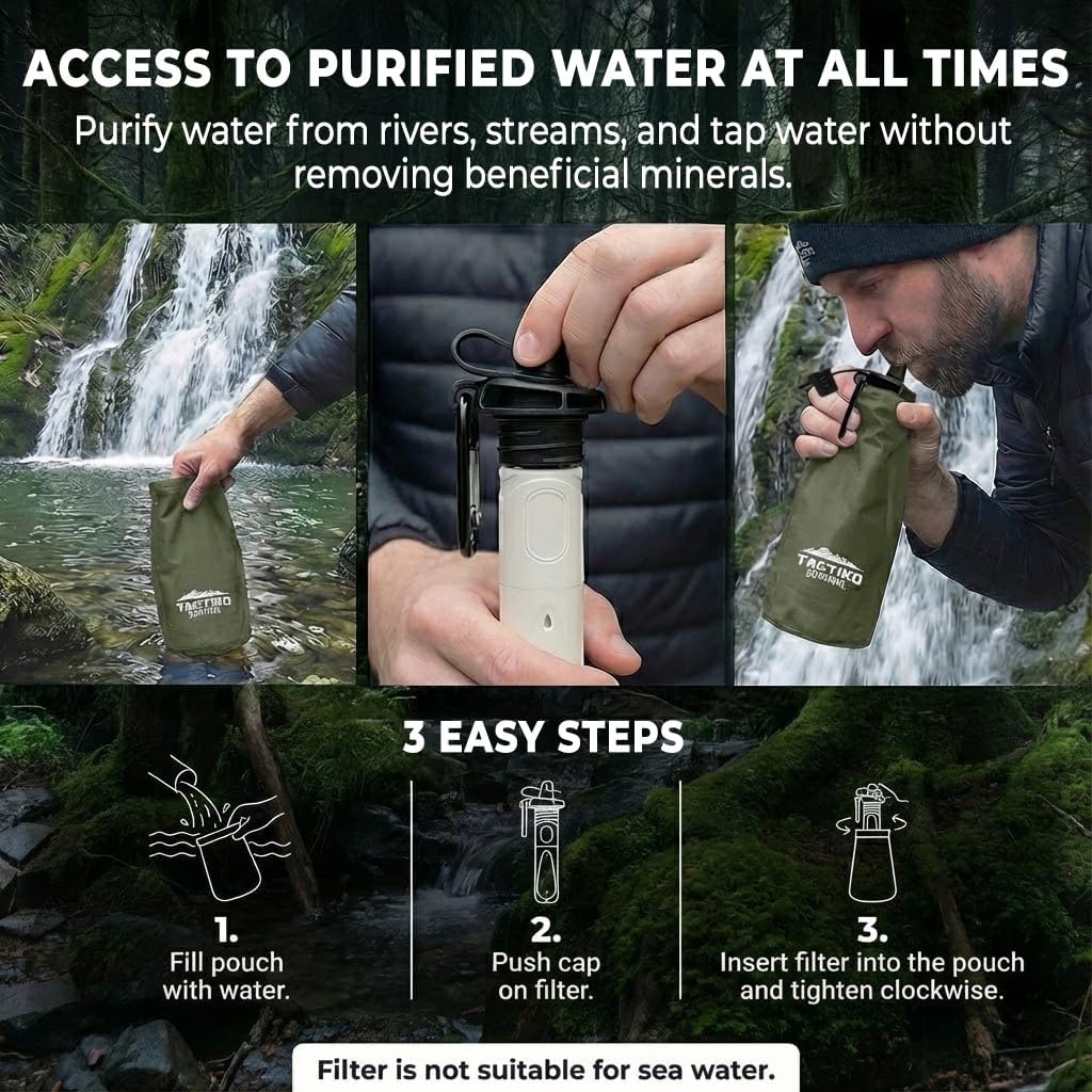 Whether you are deep in the backcountry, traveling internationally, or preparing an emergency bug-out bag, water is your most critical resource. The TactikoFiltration System lets you drink directly from freshwater sources, removing physical contaminants and instantly improving taste.
