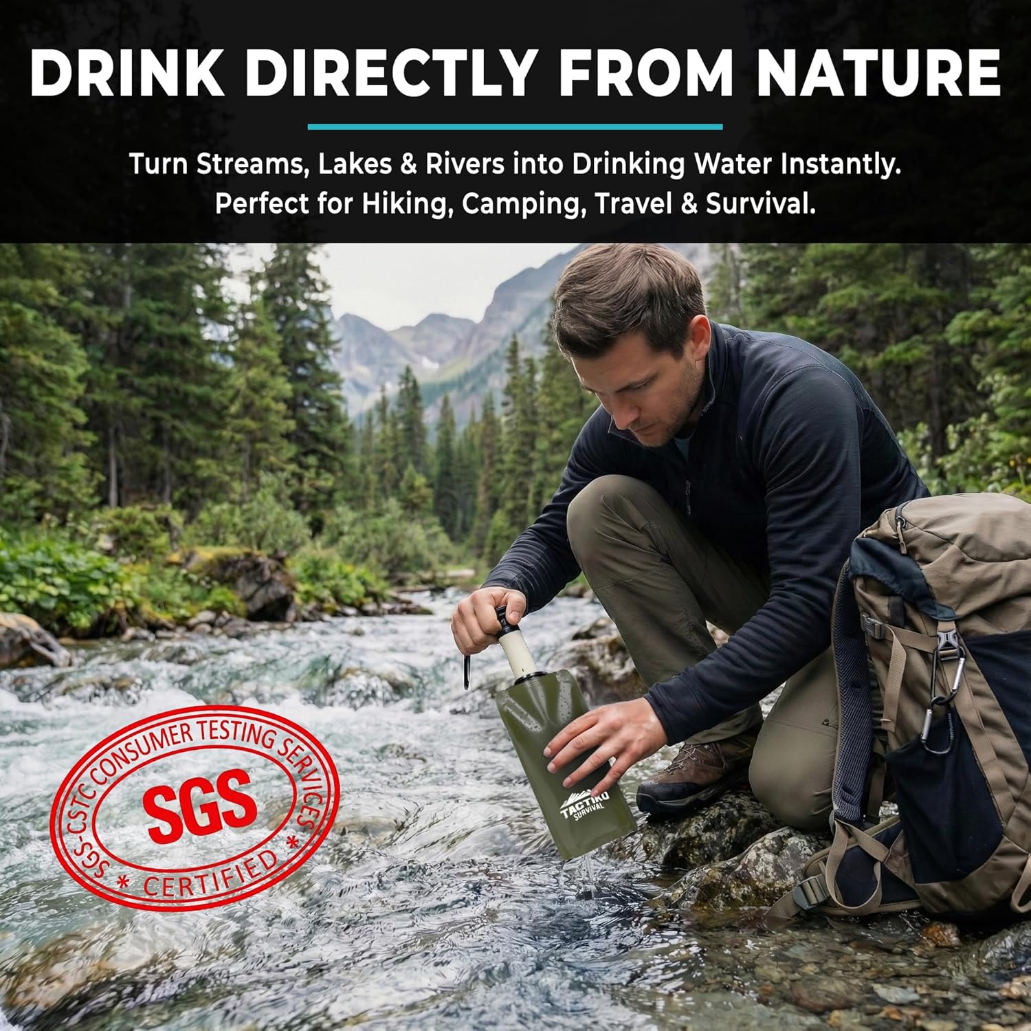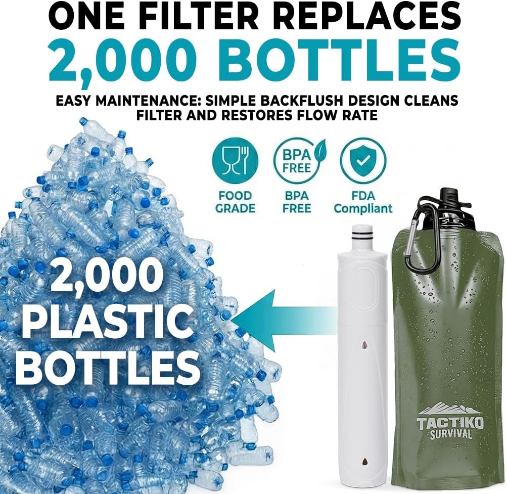 CERTIFIED SAFETY & MATERIALS: Constructed from premium food-grade, FDA-compliant polyethylene materials. The filtration performance has been rigorously tested by SGS Laboratories to meet high safety standards, ensuring you have a reliable water source for international travel, outdoor adventures, and emergency preparedness kits.