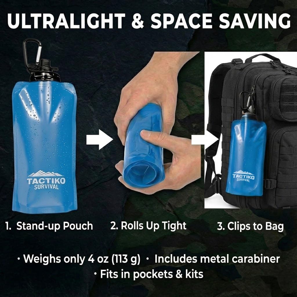 LIGHTWEIGHT & COLLAPSIBLE DESIGN: Designed for the ultralight backpacker and traveler. The durable, BPA-Free pouch rolls up tight when empty to fit into pockets or small compartments. Includes a heavy-duty carabiner for attaching to backpacks for hands-free carrying during trekking, camping, or emergencies.
