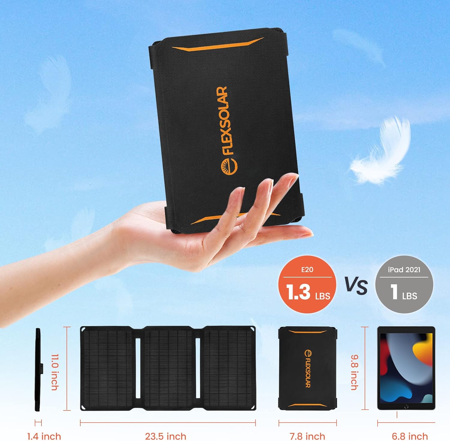 【Portable Solar Panels for Camping】The unfold size is 23.5 x 11.0 x 0.1 inch and 3 fold design with a small size of 7.8 x 11.0 x 1.4 inch (when folded) which is similar size with iPad9 2021 version of 12.9 inches ,only1.3bls (600g) and comes with 2 Carabiners that can be easily squeezed into your backpack, also hung in backpacks and tents. FlexSolar 20W solar charger offers portability and simplicity for your travel,hiking, camping and backpacking.