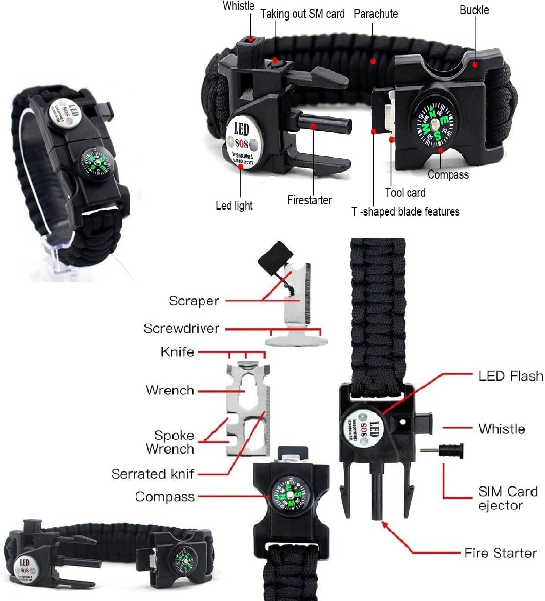 ✅ 21IN 1 PREMIUM PARACAOD SURVIVAL BRACELET: Premium quality survival bracelet gear kits contains 21 of emergency tools such as: SOS LED Light,Flint Fire Starter(Magnesium Rod), Whistle, Thermometer, SIM Pin, Parachute Cord, Compass, T Shape Tool (Protection Cover), Wrench, Bottle Opener, Can Opener, Screwdrive…You can always be prepared and protection for all kinds of outdoor wilderness adventures.