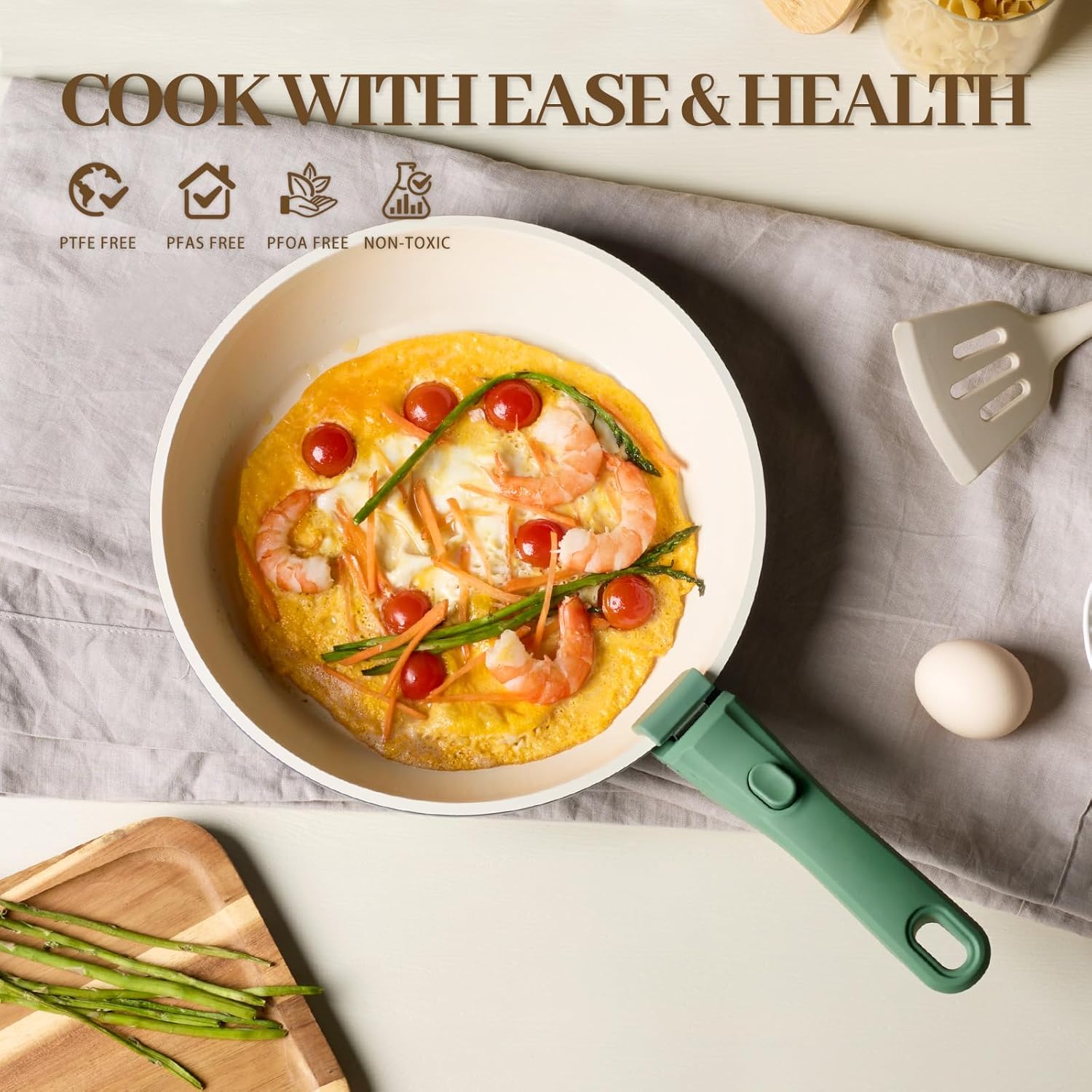 Quick & Even Heating for All Stoves- Enhanced bottom secures quick and even heating to keep you away from hot or cold spots that undermine your dish or health by leaving some food overcooked and some undercooked. A high conductive base allows our nonstick cookware to work well on all cooktops, including induction, gas, electric, ceramic stoves and also oven safe up to 450°F