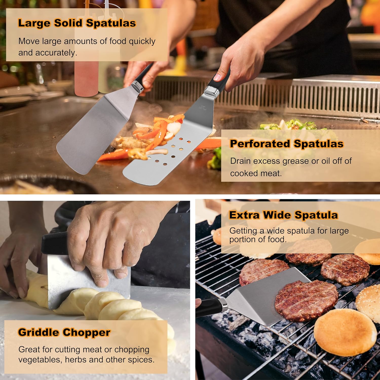 Durable and Easy Clean Design: Engineered for lasting durability! Ergonomic non-slip handles ensure a secure and comfortable grip; The stainless steel tools in this griddle accessories are heat-resistant and resistant to warping; For a truly effortless cleanup, our flat top griddle set are dishwasher-safe; Plus, the cleaning brush easily handles grease and food residue on your flat top grill