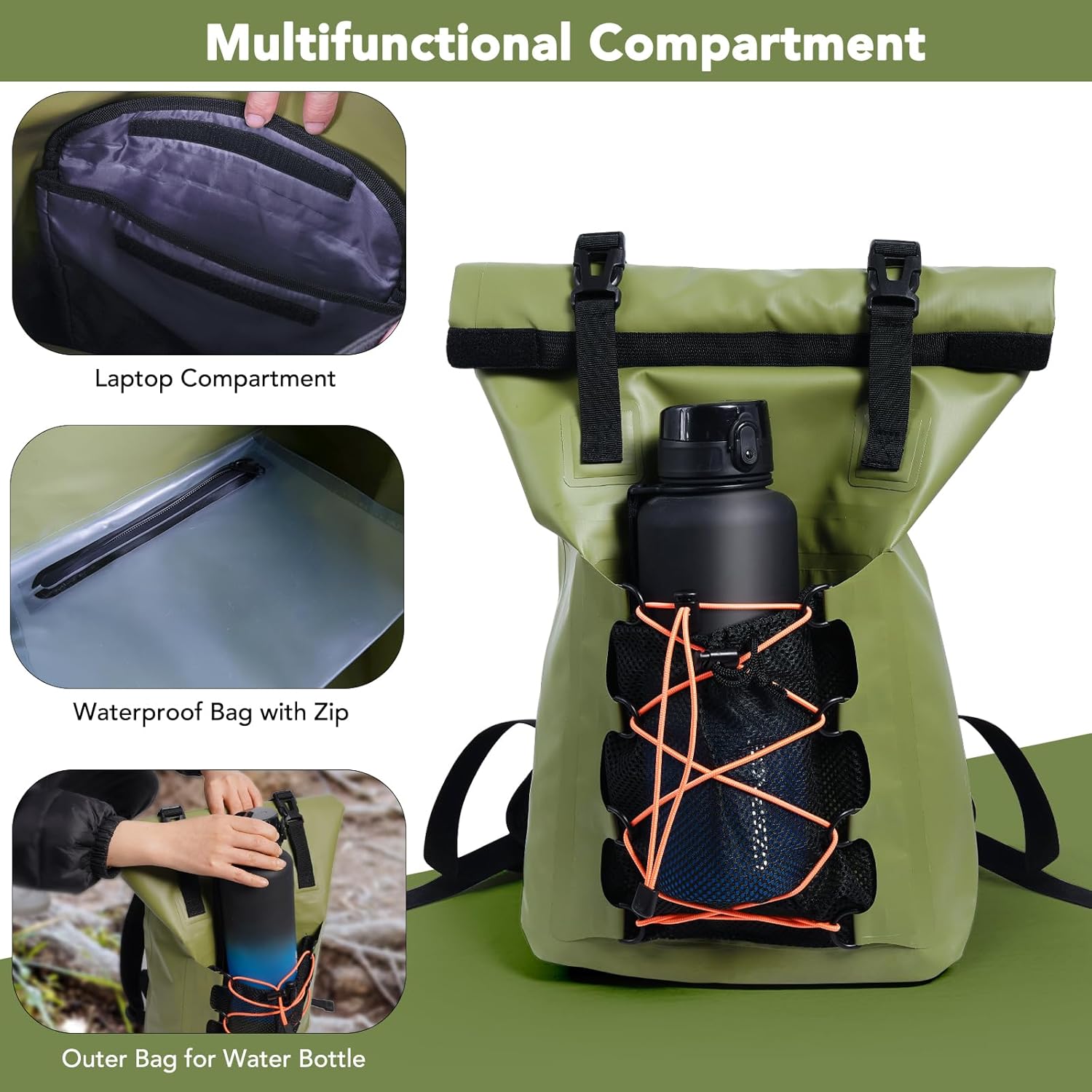 REMOVABLE LAPTOP SLEEVE & INNER POCKETS: Unlike basic hollow dry sacks, this 23L backpack features a detachable padded organizer to protect your laptop/tablet from shocks. Includes an internal zip pocket for keys, wallet, and cables, making it the perfect weatherproof commuter bag for students and professionals.