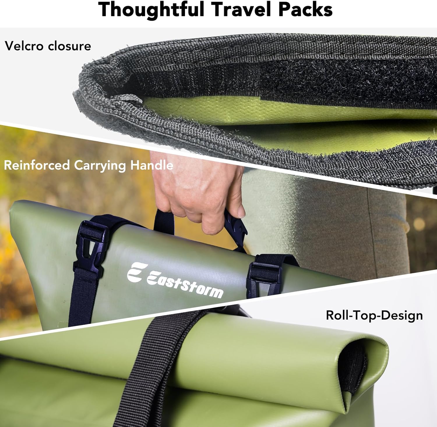 100% WATERPROOF 500D PVC CONSTRUCTION: Engineered for extreme conditions. Made from industrial-grade 500D PVC tarpaulin with high-frequency welded seams (no needle holes). The secure roll-top closure creates a watertight seal, keeping your gear bone-dry whether you are kayaking, caught in a rainstorm on your motorcycle, or boating.