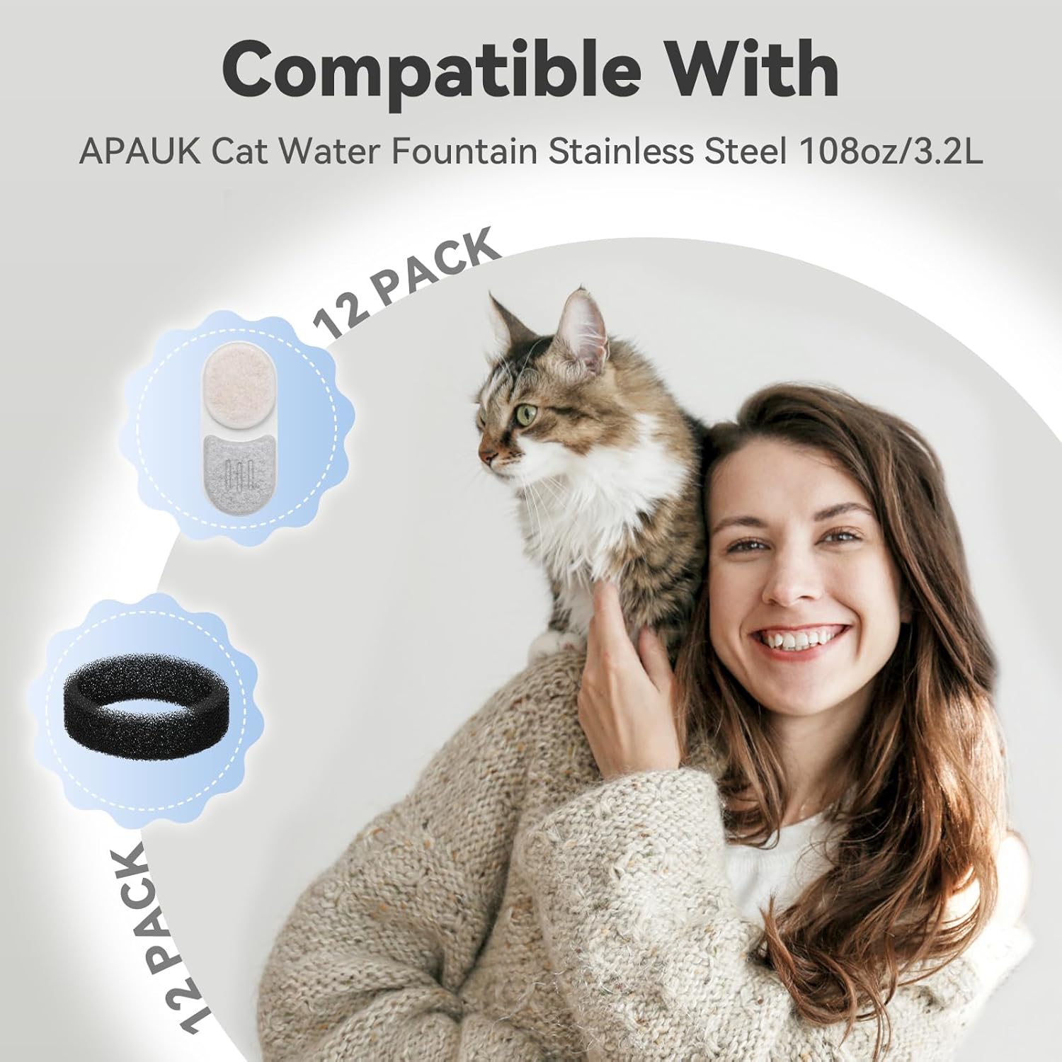 【Compatible with】 These replacement filters and sponges are compatible with APAUK Cat Water Fountain Stainless Steel 108oz/3.2L; includes 12 filters + 12 sponges; maintains water purity at a budget-friendly value.