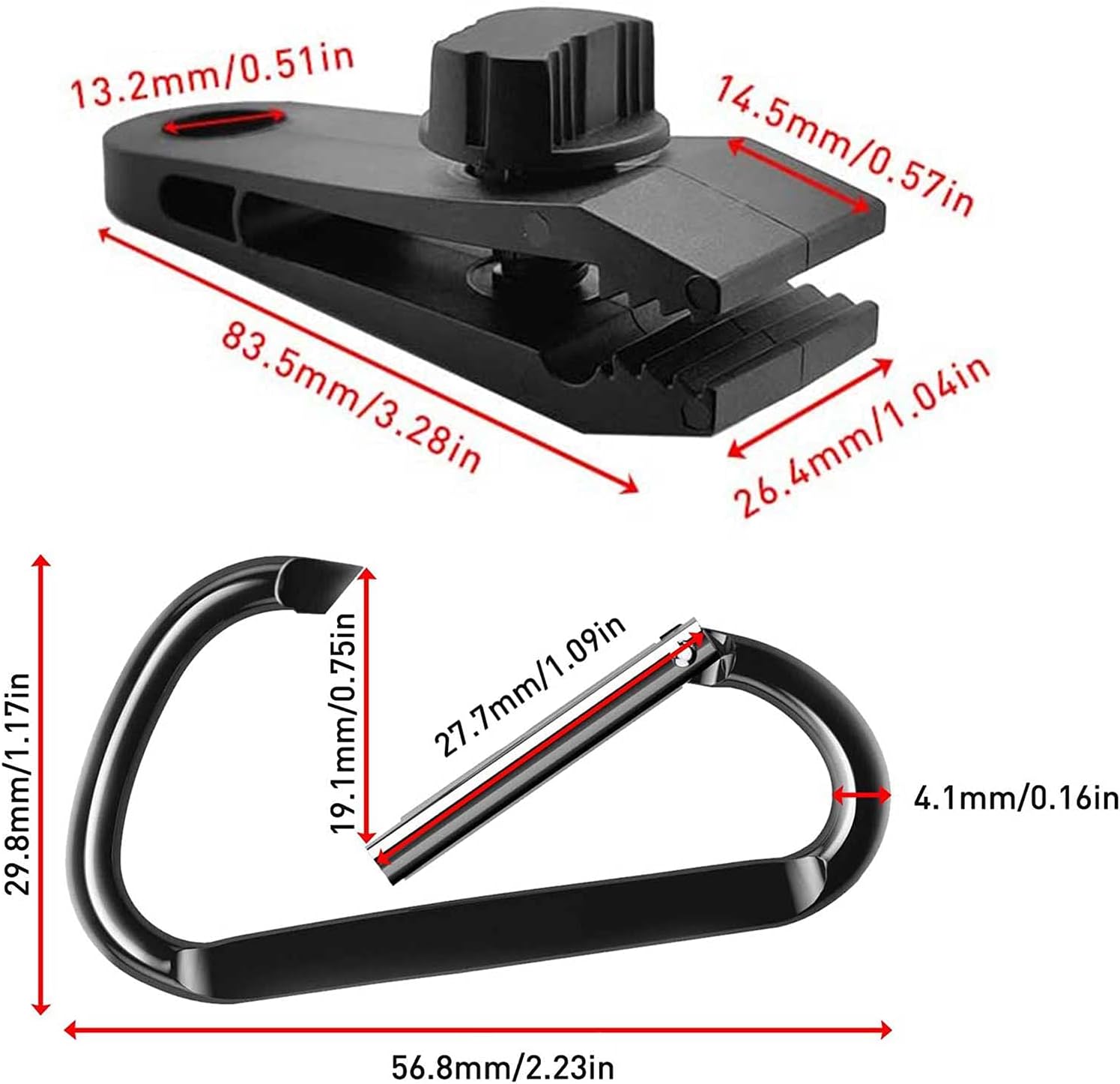 Specification:Heavy Duty Lock Grip Tarp Clips with CarabinerTarp clips: 3.3 x 1.0 x 1.1 inches (L x W x H).Carabiner : 2.23 x 1.17 x 0.16 inches (You can see the detail size in the picture). Features:Easy to install or remove, just tighten or loosen the screw knob to adjust on thick or thin tarps.Tent Clamps are perfect for holding up tarp, canopy, rain-fly, car/truck cover, bike cover, boat cover, pool cover, sun shade, temporary projector screen, couch cover and so on. Package Included:12 x Tarp Clips Clamps 12 x Carabiner Clips
