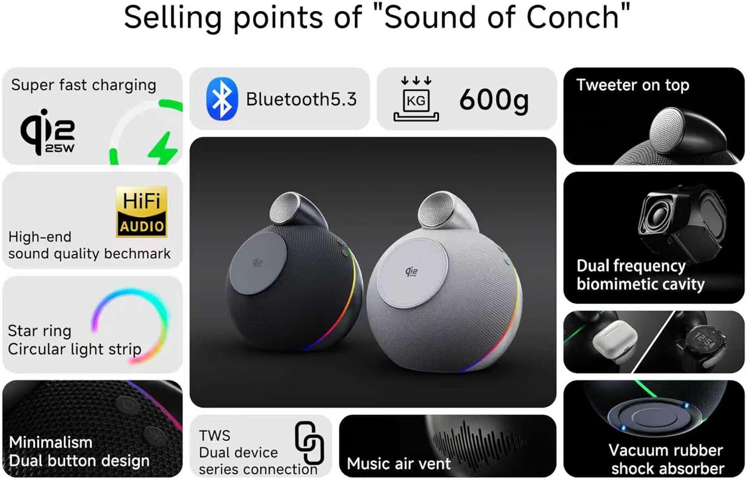 Gradient Ambient Light, Visualize Your Music: As a wireless charger with light, its lights flow gradually with the melody, letting you “see” music emotions. Multiple light modes are adjustable to create your exclusive audio-visual space—whether for parties or alone time, light and shadow dance to the rhythm.