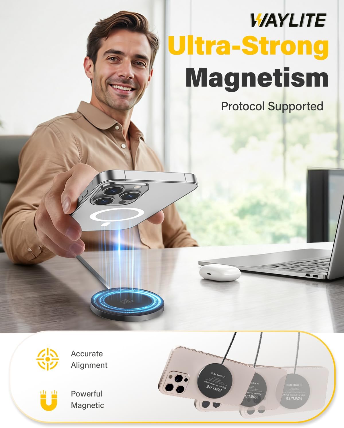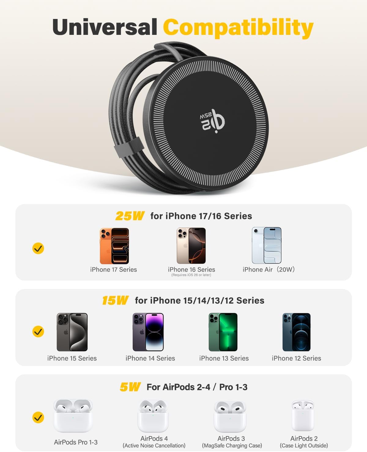 【Universal Compatibility】: The 25w magnetic wireless charger pad specially designed for Apple iPhone 17/ 17 Air/ 17 Pro/ 17 Pro Max/ iPhone 16/16 Pro/16 Pro Max/16 Plus, iPhone 15/15 Pro/15 Pro Max/15 Plus, iPhone 14/14 Pro/14 Pro Max/14 Plus/ 13 Pro/ 13 Pro Max/ 13 mini/ 12/ 12 Pro/ 12 Pro Max/ 12 mini/ for AirPods 3/2/Pro/Pro 2 and other Qi2-enabled devices for versatile daily use.