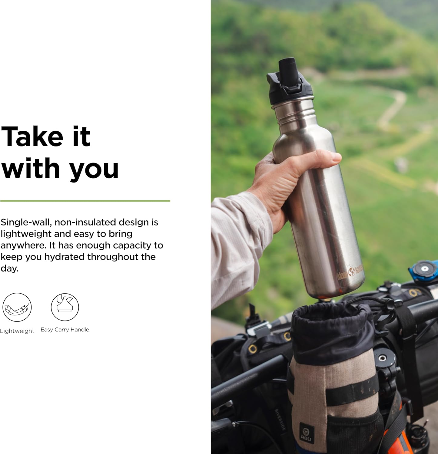 Compact & Lightweight: The Klean Kanteen classic 27 oz water bottle size has a narrow profile, ergonomic design, and easy-grip handle which is ideal for portability; fits in most cup holders and bags