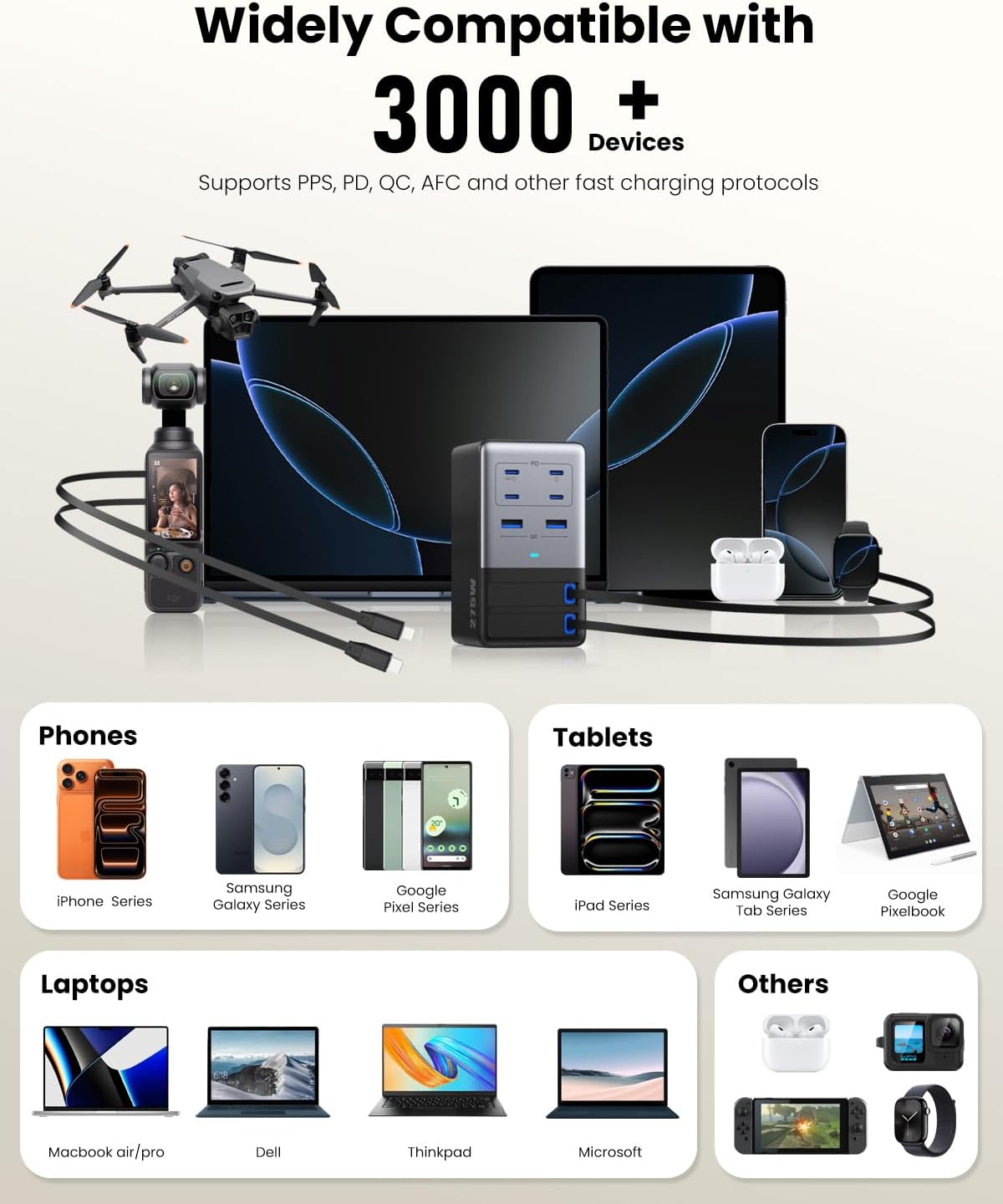 【Universal Compatibility】This usb c charging station provides fast charging to virtually all USB-C and USB-A powered devices, supporting a variety of charging protocols( PD3.1, QC4.0, PPS/AFC/ FCP/SCP etc). Compatible with MacBook Pro/Air, iPad Pro/Air/Mini, XPS, ThinkPad, MateBook, iPhone 17/16/15/14/13/12/11/X series, Samsung S24+/S24/S23 Ultra/S23/S22/Note 20 series,Pixel 2/3/4/4a/5, AirPods, Switch and more other laptops, tablets and phones.