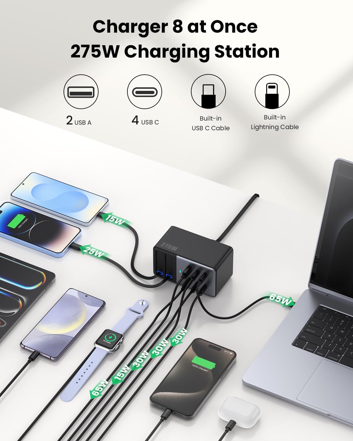 【Upgraded 8-in-1 Versatile Charging Station Organizer】Experience the ultimate solution with our NEWLY UPGRADED 8-in-1 275W Charging Station! Featuring 2 built-in retractable cables (Light-ning & USB-C) plus 6 dedicated ports (4x USB-C, 2x USB-A), ensuring all devices can charge simultaneously at full speed! One versatile desktop charging solution provides multi charging options to meet all charging needs of your families, ideal for the home, office, and college dorm room essentials.