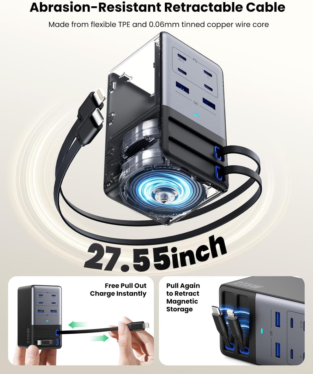 【Ultra-Portable Design with Retractable Cables & AC Extended Cable! 】Our 275W GaN charger with 2 retractable charging cables that extend up to 27.5 inches and automatically retract for easy,tangle-free storage at home,office,or traveling. Includes a detachable 5ft AC power cord for flexible placement on nightstands,counters,or service desk. Achieve a clean, organized workspace! Package Includes: 1x 275W Charging Station,1x 1.55m AC Cable, User Manual,backed by 24/7 support and 2-Year Warranty.