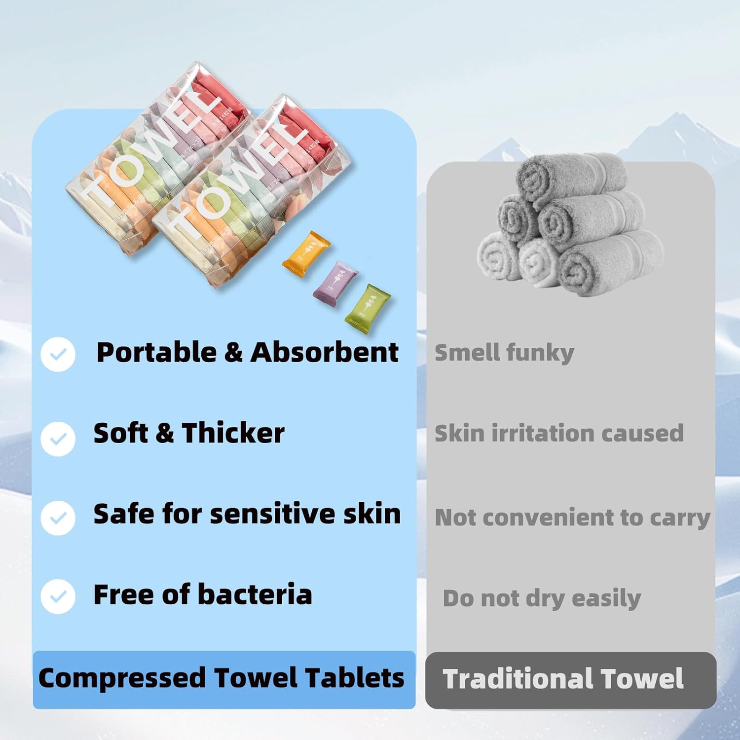 Portability & Travel-Friendly: Compressed towel tablets are individually wrapped and easy to carry. They are small enough to fit in any suitcase, backpack, or even in your bags, purses, or pockets, and can be transformed into full-sized(11*9.5 inches) towels with just a tablespoon of water whenever you need a towel.