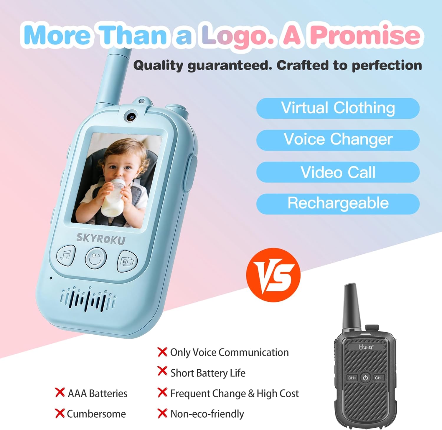 Second-Gen Video Walkie Talkies with AI Magic! See & Play in Real-Time: Unlike old walkie talkies, our upgraded camera lets kids see each other while chatting. They can wear 4+ virtual costumes and change voices with 4 fun modes (Robot, Monster, etc.), turning every call into a creative costume party
