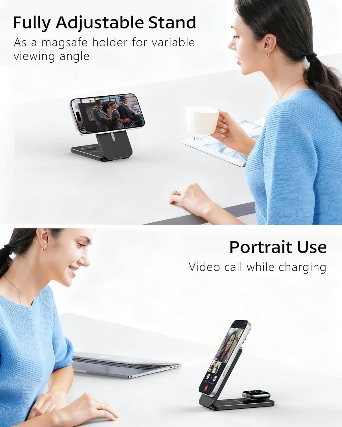 【Versatile Adjustable Magnetic Stand】Customize angles on this adjustable Magnetic stand for flawless hands free FaceTime calls, video streaming, or work sessions. Doubles as a sleek bedside wireless charger or desk stand, keeping your Apple devices visible, powered, and primed for action anytime.