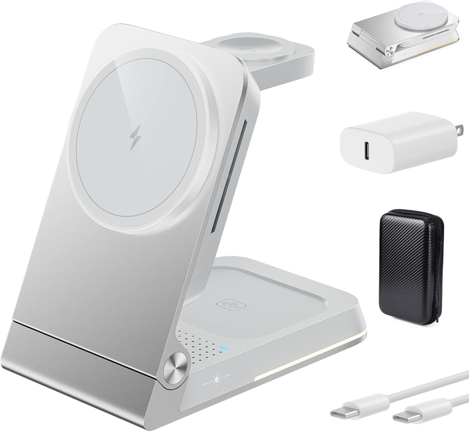 Auto-Snap Magnetic Charging Alignment for Apple MagSafe:Our magnetic wireless charger stand built-in 16 N52 magnets ensure instant alignment with iPhone 17/16/15/14/13/12 series. Charges your iPhone, Apple Watch, and AirPods (with wireless case) simultaneously—perfect for home, office, or travel