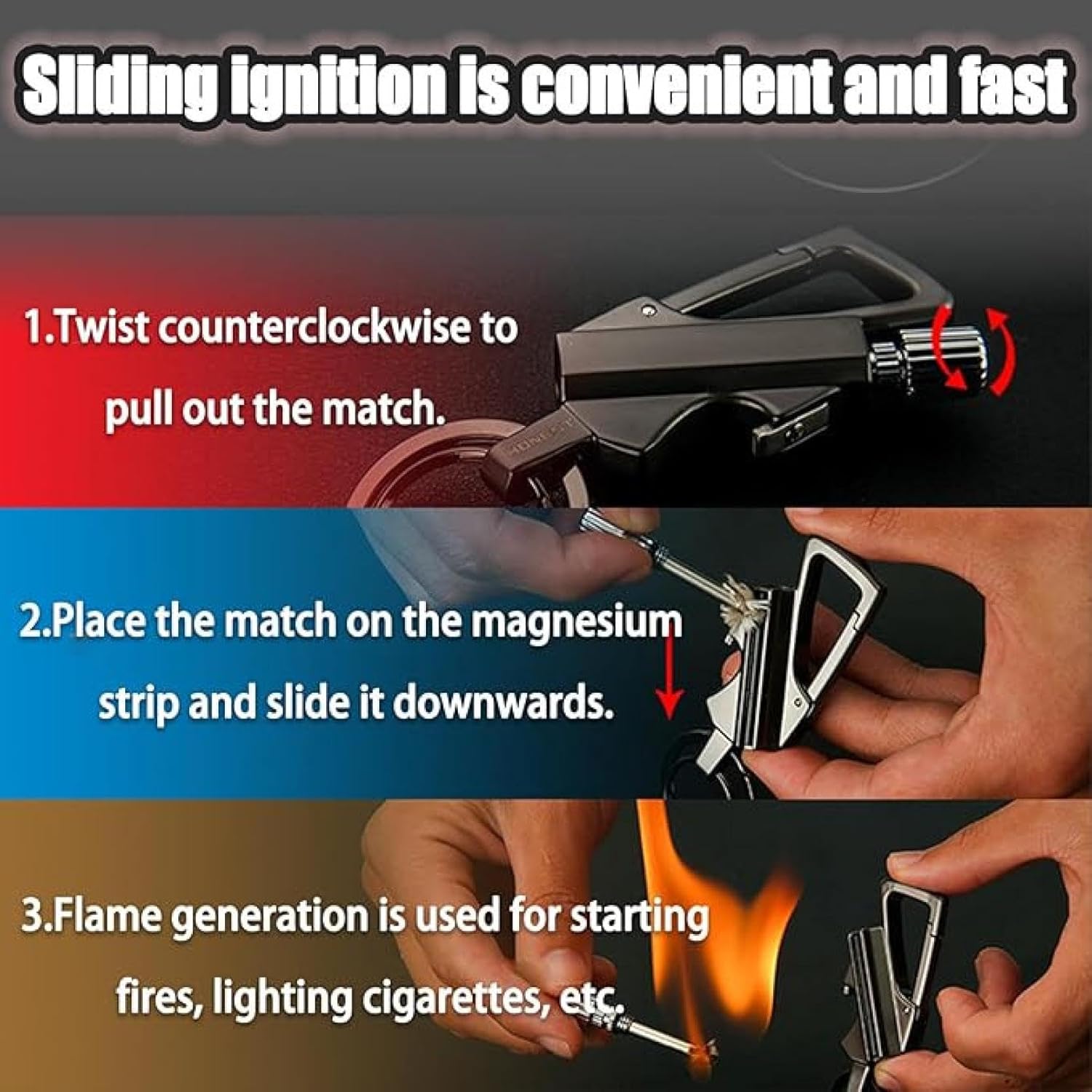 【VERSATILE】This metal keychain is a tool as it combines and convenience, which making it a must-have hiking or camping gear for hunting, traveling and other outdoors activities. Works equally well even when wet or cold.
