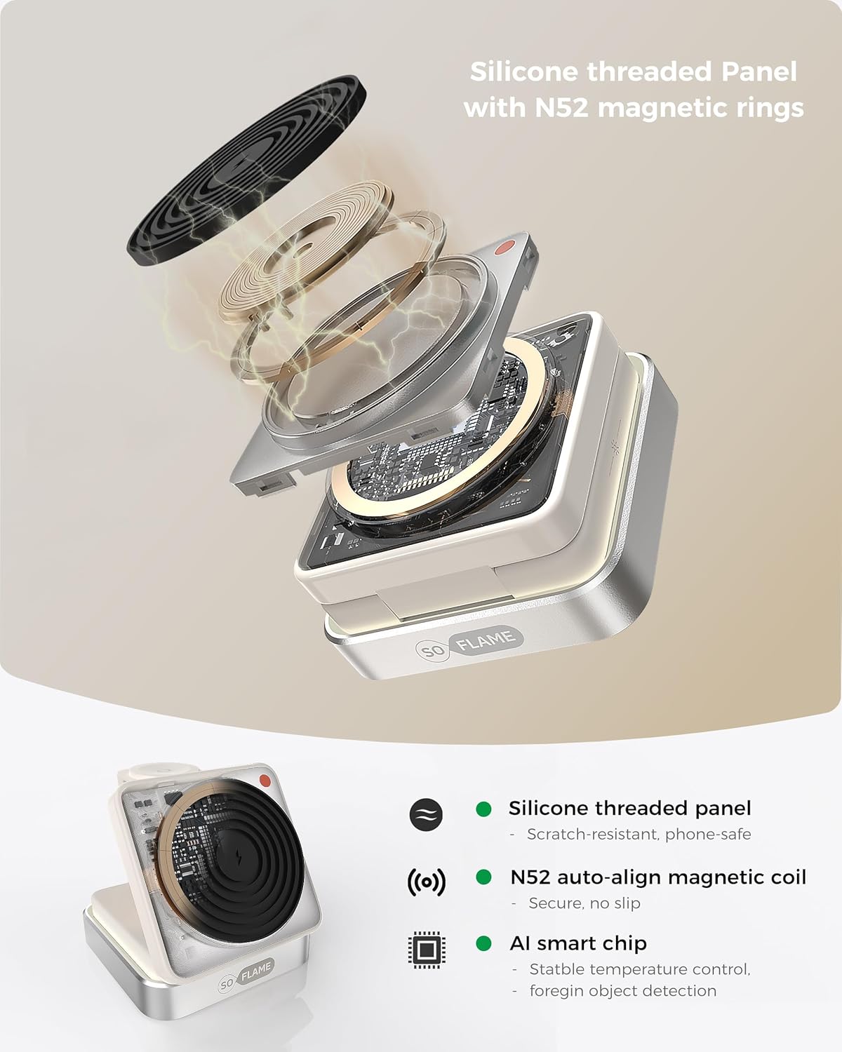 [Premium Build & Retro Design] Crafted from durable PC with a brushed aluminium alloy base for stability. Features a retro vinyl record–style silicone-threaded magnetic panel—more durable than acrylic, scratch-resistant, gentle on devices, and excellent for heat dissipation. Includes an LED ambient light ring with touch control—switch between warm yellow or off, and long-press to adjust brightness.