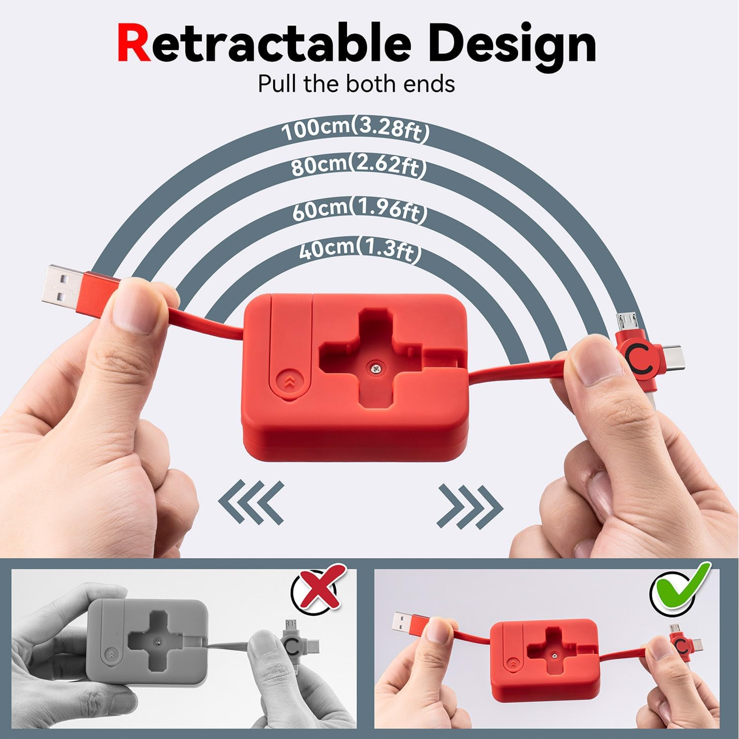 ● 3.3Feet / 100cm is perfect length for long distance charging, 4 in 1 retractable design, makes the cord portable and only need one cable when you are on a business trip or traveling.