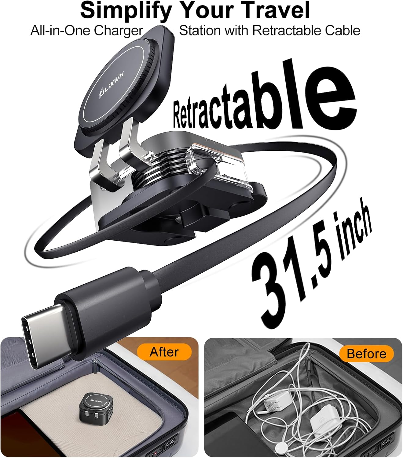 【Retractable Design, Portable Size】First iphone charging station with retractable cable(31.5 inches) on market, say goodbye to messy and tangled cable. It not only retains advantages of magsafe stand, but also achieves ultimate in lightness and portability. Foldable design and compact size(Size Similar to AirPods 3), which can be easily placed in pocket anytime and anywhere.Portable iphone charger stand also acts as holder anytime, making it perfect assistant for TV and video calls on the go