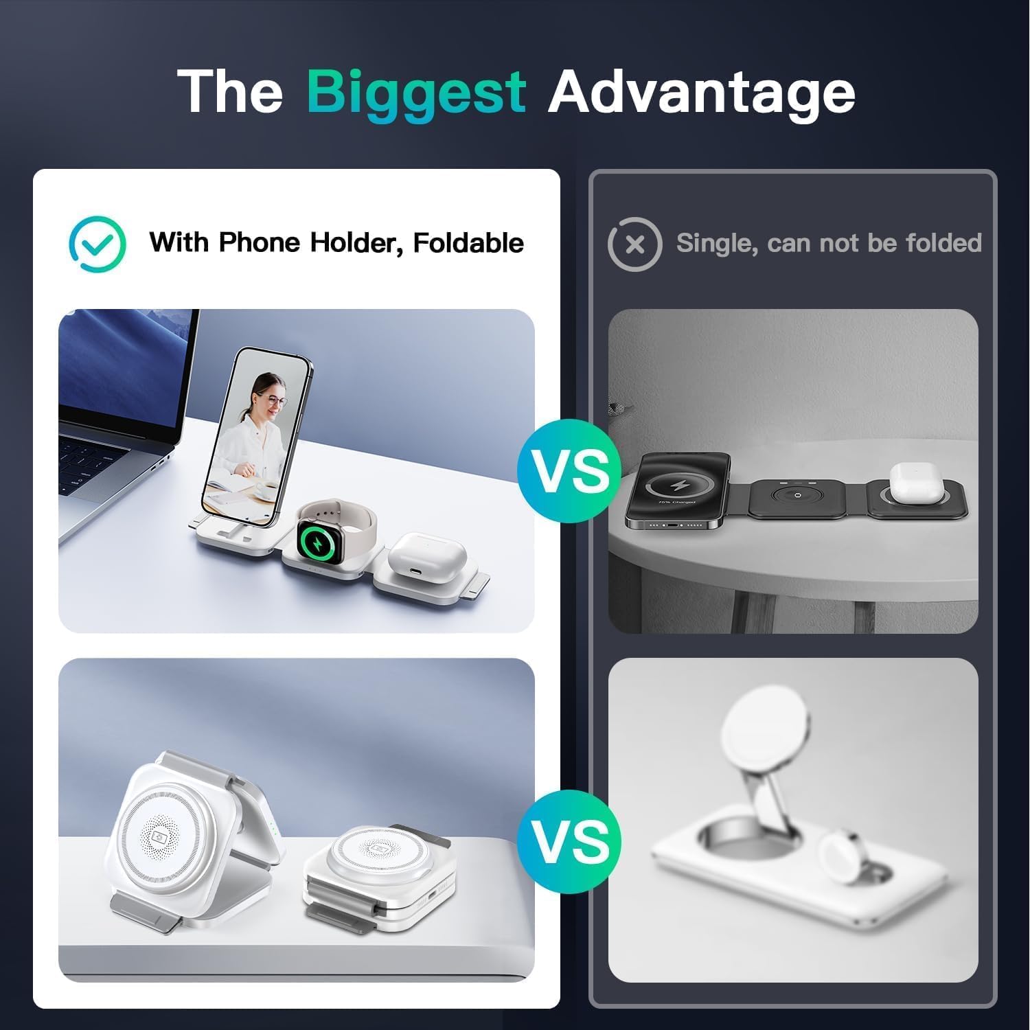 ✈️[𝗟𝗶𝗴𝗵𝘁𝘄𝗲𝗶𝗴𝗵𝘁 & 𝗣𝗼𝗿𝘁𝗮𝗯𝗹𝗲 𝗧𝗿𝗮𝘃𝗲𝗹 𝗘𝘀𝘀𝗲𝗻𝘁𝗶𝗮𝗹𝘀] Our foldable 3 in 1 charging station adapts to your needs whether at camp, beach, panic or other travel activities. This ultra-lightweight wireless charger folds completely flat at just 3.3x3x1.2 inches and 6.525 oz – slips easily into your bag. No more choosing which devices to charge while traveling for this portable 3-in-1 wireless charging station keeps your iPhone, Apple Watch and AirPods powered anywhere. And its durable compact design withstands life on the go while eliminating cable clutter from your journeys.