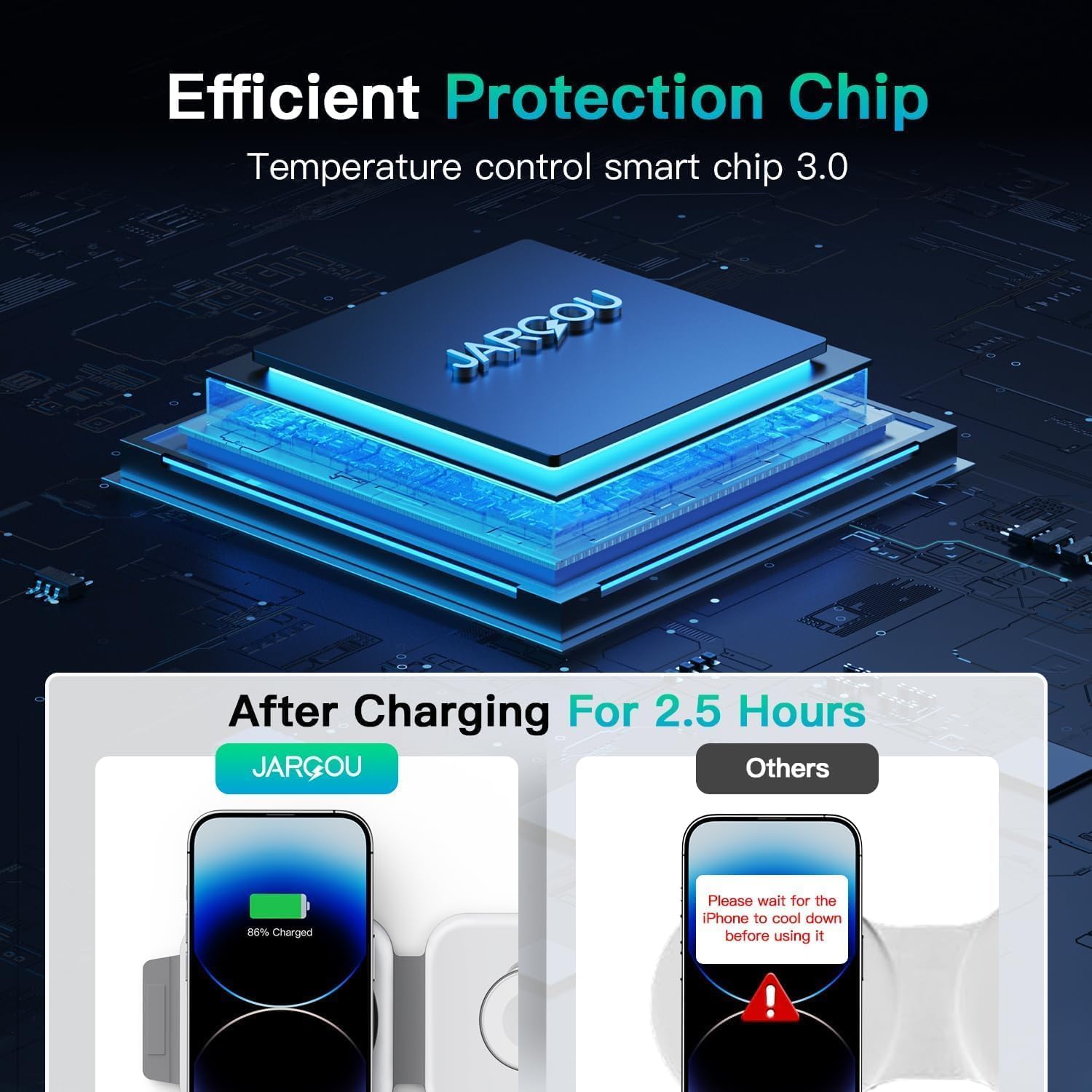 ❄️[𝗙𝗮𝘀𝘁 𝗖𝗵𝗮𝗿𝗴𝗶𝗻𝗴 𝘄𝗶𝘁𝗵 𝗔𝗱𝘃𝗮𝗻𝗰𝗲𝗱 𝗧𝗲𝗺𝗽𝗲𝗿𝗮𝘁𝘂𝗿𝗲 𝗖𝗼𝗻𝘁𝗿𝗼𝗹] Tired of slow charging and overheating devices? Our Wireless charging station features a smart temperature control chip 3.0 that prevents overheating while delivering optimal charging speeds: 7.5W for iPhone, 3W for AirPods, and 2.5W for Apple Watch. In our laboratory tests, JARGO can fully charge iPhone17 in just 3.2 hours without dangerous overheating, while other brands required cooling periods. This fast wireless charging station protects your valuable devices with triple protection against over-voltage, over-current, and over-temperature issues.