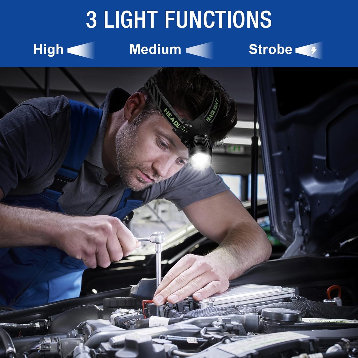ULTRA BRIGHT HEADLAMP WITH 3 MODES: Equipped with a powerful LED chip, our rechargeable headlamp provides up to 99000 lumens of super bright light for clear visibility. In addition, choose from high, medium, and strobe modes to suit any activity, whether you’re camping, hiking, working outdoors, or handling emergencies