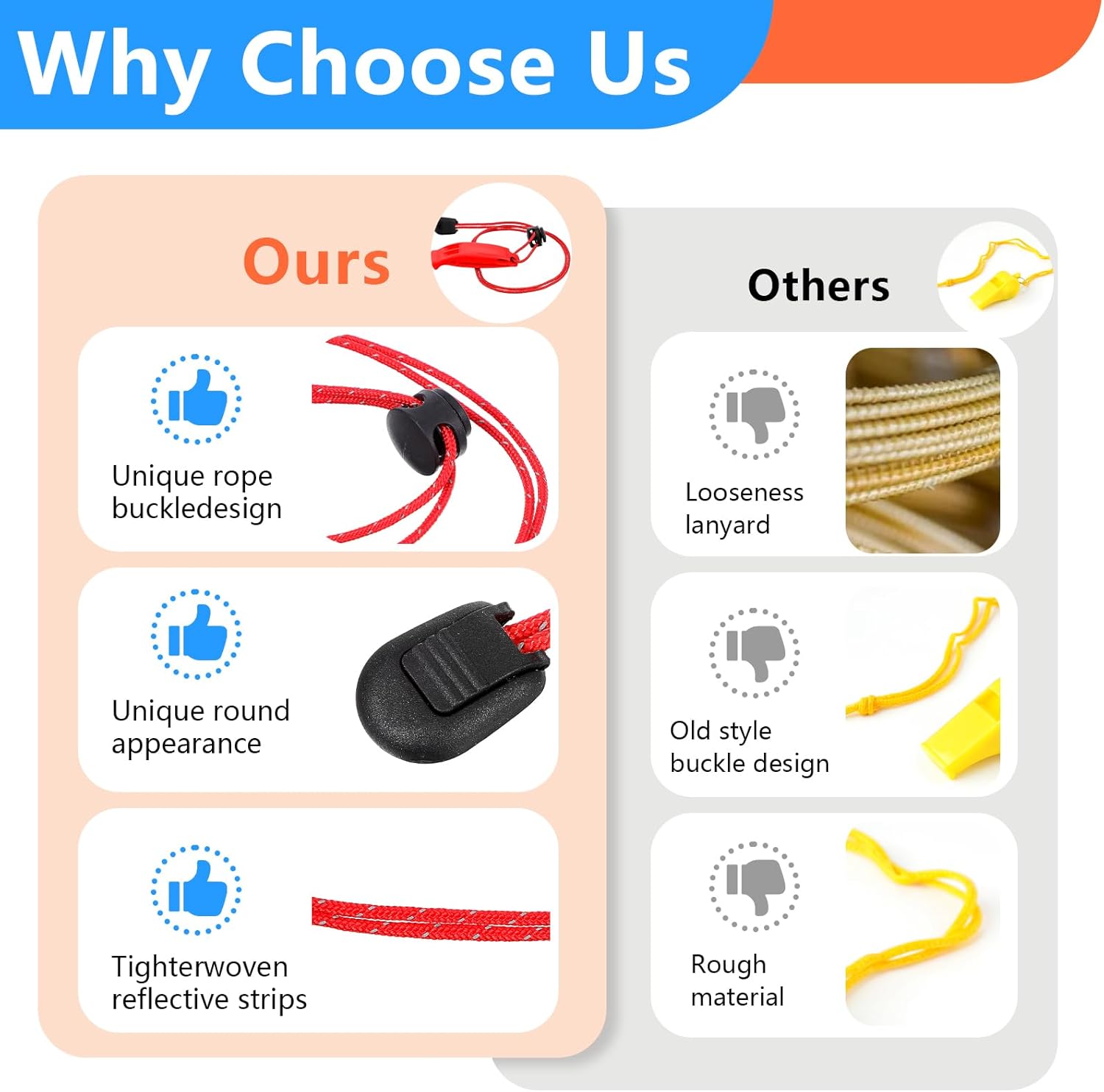 【ADJUSTABLE DESGN】Plastic whistle with reflective lanyard, even in the dark is easy to find, long lanyard with a slide buckle to adjust the length of the rope, can be easily worn around the neck